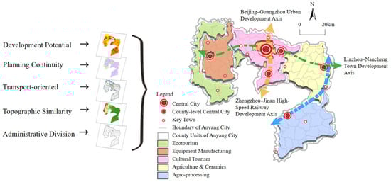 In line with the principles of planning alignment, the functional zoning was optimized. The central urban districts of Anyang, together with the counties of Tangyin, Linzhou, and Neihuang, were designated as comprehensive-type townships due to their higher economic levels, faster industrial development, and political–cultural functions. Yaocun, Hejian, and Shuiye counties, where secondary industry was rapidly expanding, were classified as industrial-type townships. Resource-rich and suitable areas in the east were designated as tourism service-oriented townships. Guided by transportation corridors and topographic differentiation, regional coordination was promoted. The Beijing–Guangzhou development axis and the Zhengzhou–Jinan high-speed rail economic belt were leveraged to form two major growth axes. The western hilly–mountainous belt, with favorable ecological conditions, was delineated as an environmental protection and ecotourism zone, while the eastern plain, with substantial farmland potential, was positioned as a specialized agricultural production zone.