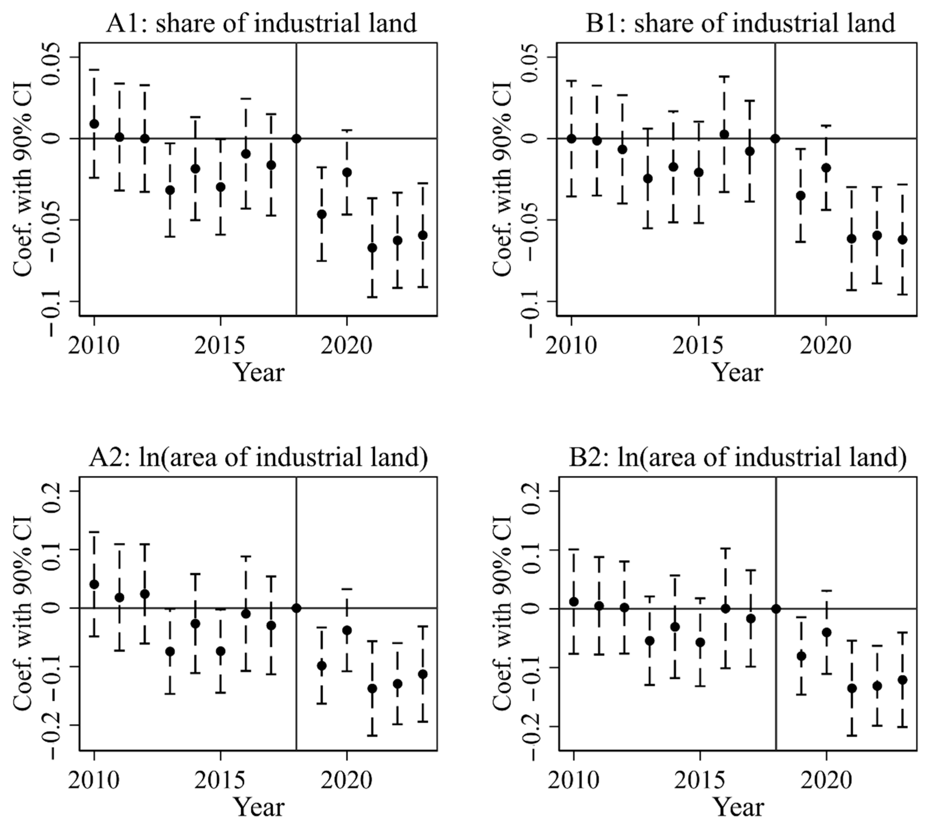 | 22. | With over 200 zeros in high-tech industrial land area, an average treatment effect in logs is not well-defined. We therefore re-estimate the specification from the second line of the right panel in Figure 7 using Poisson pseudo-maximum likelihood model [54] and results remain largely unchanged (Table A6 of the Appendix A). |