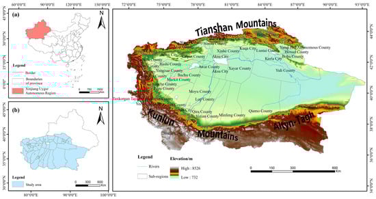 The location of the research area: (a) Red region represents the Xinjiang Uygur Autonomous Region; (b) Light blue region represents the Tarim River Basin. Note: White areas represent the Xinjiang Production and Construction Corps (XPCC), which are excluded from the study due to data availability and administrative considerations.