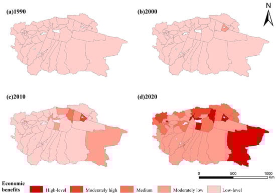 The economic benefit values of land use in each county-level city of the Tarim River Basin increased from 0.020–0.076 in 1990 to 0.007–0.778 in 2020, showing an overall upward trend. The average values in 1990, 2000, 2010, and 2020 were 0.022, 0.035, 0.080, and 0.224, respectively, demonstrating a year-by-year increase. The largest growth occurred between 2010 and 2020, though the overall benefit values remained low. According to the spatial distribution map (Figure 2), land use economic benefits exhibited a spatial pattern of “higher in the east, lower in the west.” High and relatively high value areas were concentrated in the central cities of the five prefectures in the Tarim River Basin and their adjacent county-level cities. In 2020, high-value areas included Korla City, Kashgar City, Aksu City, Kuqa City, and Ruoqiang County, while most other counties remained in the relatively low-value range. In 1990, all 42 counties were in the low-value category. Overall, low and medium-value areas accounted for a large proportion of land use economic benefits in the counties of the Tarim River Basin, with high and relatively high values mainly concentrated in the central cities of each prefecture and their neighboring cities, and the growth trend remained slow.