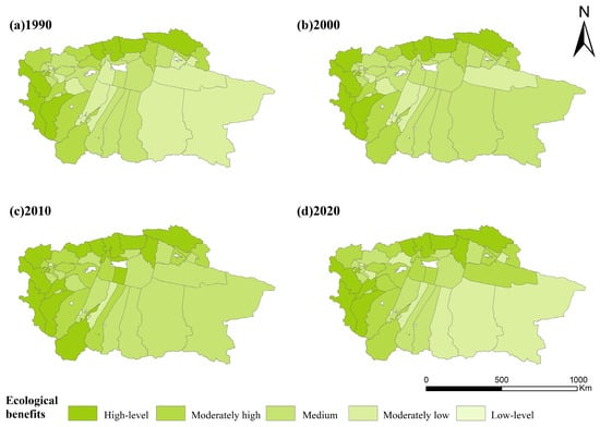 The ecological benefit values of land use in each county-level city of the Tarim River Basin changed from 0.114–0.481 in 1990 to 0.108–0.592 in 2020. The average values in 1990, 2000, 2010, and 2020 were 0.271, 0.290, 0.345, and 0.314, respectively, showing an overall trend of first increasing and then decreasing. In terms of the spatial distribution map (Figure 4), high-value areas of land use ecological benefits are mainly distributed in counties along the Tarim River and around the Taklamakan Desert. As southern Xinjiang is located in an arid and semi-arid region, water resources have a significant impact on the ecological environment, so the concentration of high-value areas along rivers demonstrates the critical role of water sources in the ecology of each county. The figure shows that ecological benefits are mainly distributed in medium and relatively high-value areas, with no low-value areas. In 2020, there were 13 counties in the high-value zone, 16 in the relatively high-value zone, and 13 in the medium-value zone. Overall, the land use ecological benefits in the Tarim River Basin are generally good, but the proportion of high and relatively high-value areas has shown a decreasing trend.