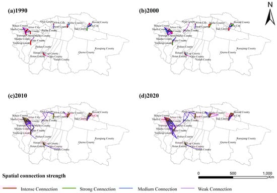 The gravitational model was used to calculate the spatial linkage intensity of land use benefit coupling coordination degree, which was divided into five levels: strong linkage, relatively strong linkage, general linkage, relatively weak linkage, and weak linkage (Figure 6). Due to the large number of county-level cities in this study, the generated spatial gravitational lines are numerous, causing clutter in the spatial distribution map; therefore, weak linkage intensity is not displayed. As shown in Figure 6, the spatial linkage intensity of land use benefit coupling coordination in the Tarim River Basin counties has shown an upward trend over the years. Significant changes occurred in the spatial linkage pattern from 1990 to 2020, with enhanced overall coordination: more counties have formed linkages with central cities and their neighboring counties, the gravitational gap between cores and peripheries has narrowed, and spatial linkages have comprehensively strengthened. Specifically, the spatial linkage intensity in the Tarim River Basin exhibits an evolutionary trajectory of “core polarization-axis belt expansion-networked coordination,” primarily concentrated in the linkages between the central cities of the five prefectures in the Tarim River Basin and their surrounding counties. In the network pattern, areas with relatively strong linkages are mainly concentrated in the oasis irrigation districts of the Tarim River Basin, with linkage axes linearly distributed along the main stream of the Tarim River. However, the hinterland of the Taklamakan Desert remains a weak linkage zone.