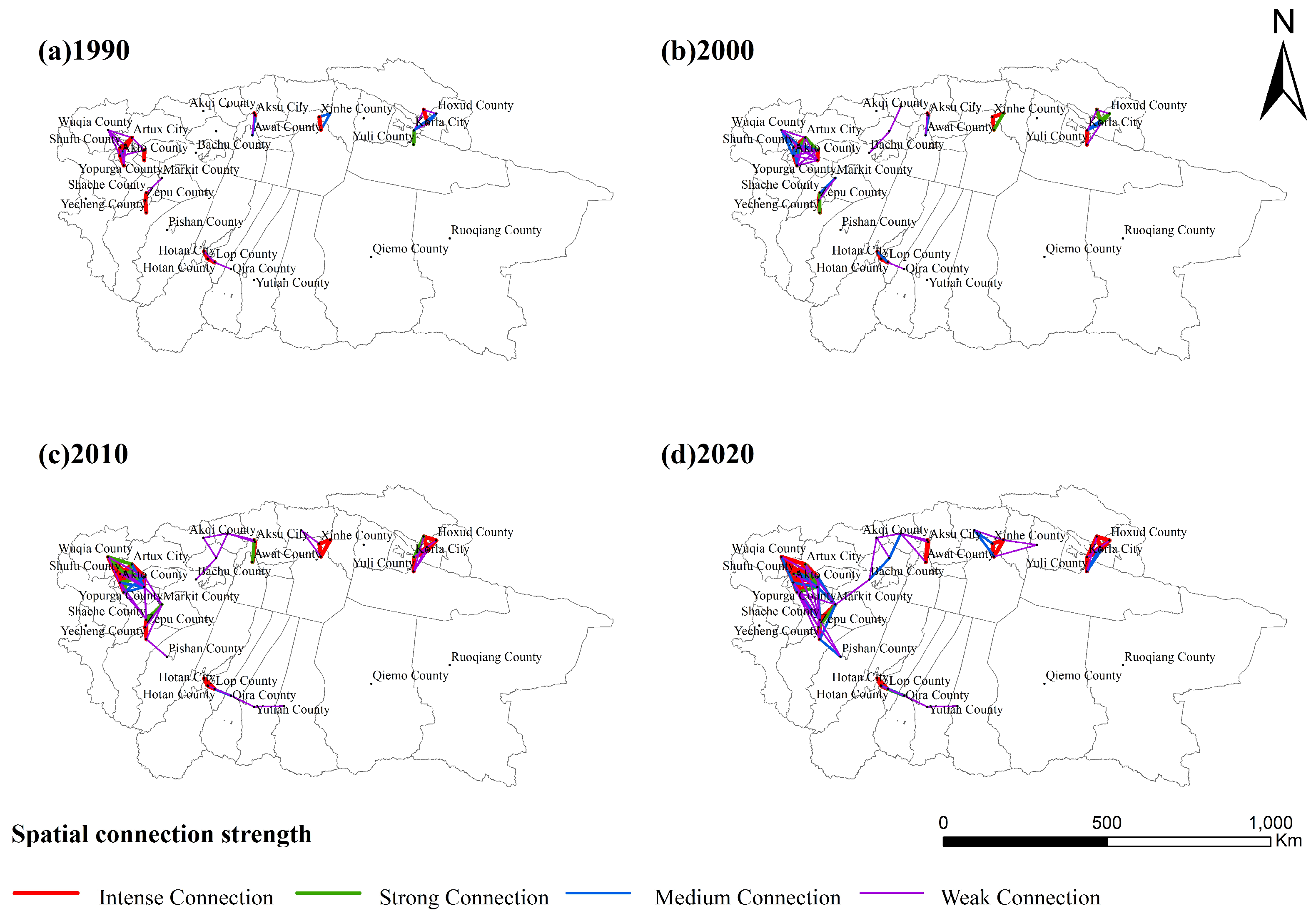 3.3. Analysis of Spatial Linkage Intensity of Land Use Benefit Coupling and Coordination