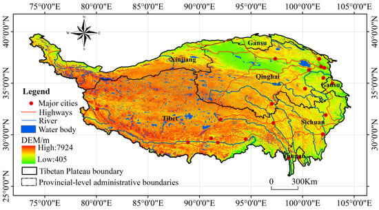 The Tibetan Plateau, situated in western China (73°~96° E, 27°~37° N), spans approximately 250 × 104 km2 and has an average elevation exceeding 4,000 m, making it the highest and most topographically complex plateau on Earth [,] (Figure 1). The climate is predominantly cold and arid, with mean annual temperatures generally below 0 °C and precipitation exhibiting a pronounced spatial gradient, decreasing from over 800 mm in the southeast to less than 100 mm in the northwest []. The region’s main ecosystem types include alpine meadows, grasslands, forests, and wetlands. Alpine meadows are the most widespread, whereas forests are primarily concentrated in river valleys in the southeastern plateau []. Due to short growing seasons and low productivity, these ecosystems are highly sensitive to both climate variability and human disturbances.