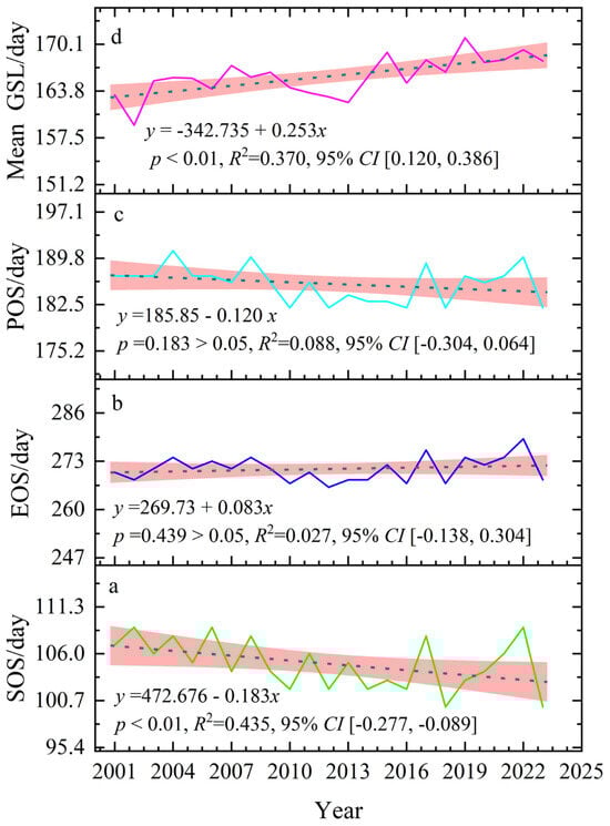 All phenology parameter extraction and analyses were conducted on the GEE platform. Processing was implemented via custom scripts and parallelized at the pixel level, ensuring computational efficiency and reproducibility for large datasets []. Furthermore, trend analysis of the GSL can also be implemented through MATLAB programming (version R2016b) (Attachment S3). Python (version 3.8) code was developed to convert original Julian dates to Day of Year (DOY) and calculate the corresponding month and day in MM-DD format based on DOY (Attachment S6).