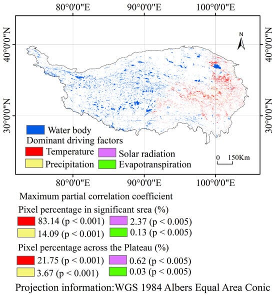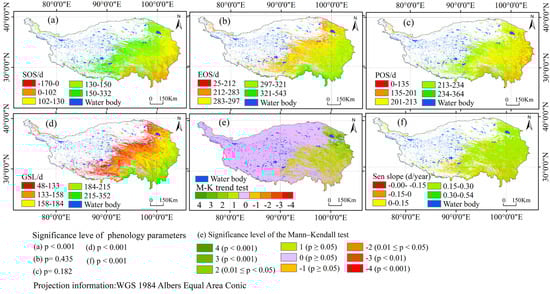 To address these gaps, this study extracted key phenological parameters of the Tibetan Plateau, including the start (SOS), end (EOS), and peak (POS) of the growing season, as well as the growing season length (GSL), using multi-source remote sensing and meteorological data from 2001 to 2023. Spatiotemporal trends were assessed using Sen’s slope estimator and the Mann–Kendall test, while partial correlation analysis was applied to quantify the independent effects of multiple climatic factors and their spatial variability [,,]. The objectives of this study are threefold: (1) to quantify the independent and relative contributions of major climatic variables to vegetation phenology; (2) to reveal spatial heterogeneity and identify dominant drivers across ecological zones; and (3) to compare phenological sensitivities among grasslands, forests, and wetlands. The results are expected to elucidate the spatially heterogeneous mechanisms of multi-factor climatic influences, enhance understanding of alpine ecosystem responses, and provide a scientific basis for climate adaptation and sustainable development strategies on the Tibetan Plateau under global change.