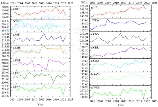 Expressed in days, GSL quantifies the duration of the vegetation growing period and provides insight into the temporal distribution of vegetation productivity []. All dates are expressed as cumulative days since 1 January 1970, to ensure consistency in data format and facilitate computation.