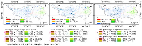 These thresholds are consistent with established regional standards. Extreme precipitation is defined as daily precipitation ≥ 20 mm, which is widely recognized as the threshold for extreme events on the Tibetan Plateau. Extreme temperature follows the Climatic Regionalization of China, where high-temperature extremes on the Plateau range from 28 °C to 32 °C; therefore, the 30 °C threshold adopted in this study falls within this established range []. Extreme radiation is defined based on data from ten Plateau meteorological stations, which reported extreme net radiation values ranging from 280 to 310 W/m2 []; thus, the 300 W/m2 threshold used here is well supported by previous findings.