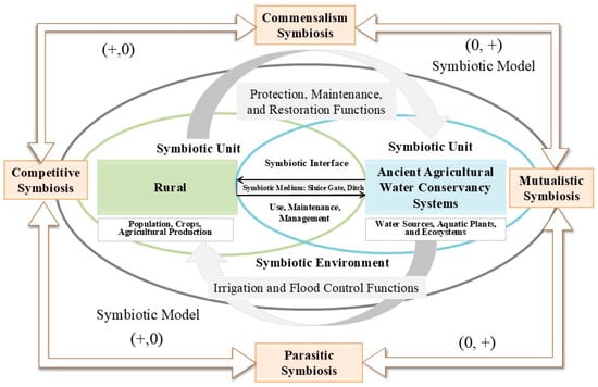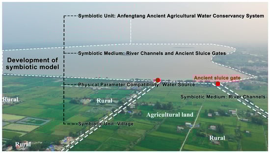 The symbiotic environment refers to the external conditions that facilitate the existence and development of the symbiotic units. It encompasses all factors, other than the symbiotic units themselves, that collectively constitute the environment in which symbiosis occurs [16]. The symbiotic environment between rural areas and traditional agricultural water conservancy facilities can be analyzed from several aspects. From the perspective of the physical environment, rural areas and traditional agricultural water conservancy facilities occupy a specific geographical space together. Their symbiotic environment includes physical factors such as air, water, and soil. The symbiotic environment must meet the survival needs of both parties, including physical conditions such as water quality, water quantity, soil fertility, and climate. From an ecological perspective, rural areas and traditional agricultural water conservancy facilities are essential components of the ecosystem. Their symbiotic environment must consider their impact and the roles they play within the ecosystem. For example, the construction and maintenance of traditional agricultural water conservancy facilities may affect the surrounding natural environment, and the ecological practices and management of rural areas may also influence the surrounding ecosystem. From a social environment perspective, rural areas and traditional agricultural water conservancy facilities have coexisted in mutual dependence. Since the Spring and Autumn Period in ancient China, these facilities have been constructed and maintained to the present day. They not only carry profound historical memories but also embody the accumulated repair expertise of rural residents, gradually becoming integral components of local social culture. The symbiotic relationship between rural areas and traditional agricultural water conservancy facilities is built upon shared historical contexts, intangible cultural heritage, and social identity (Figure 5).