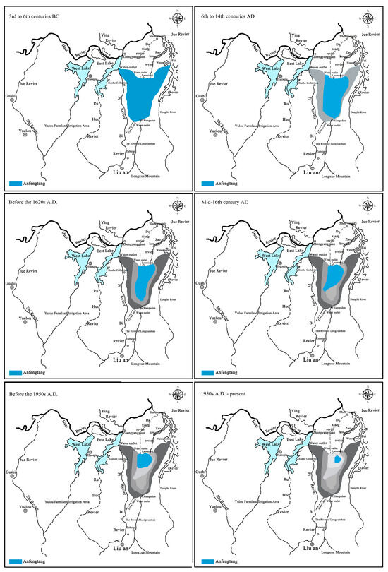 In 1951, the Shou County Government began managing and renovating the Anfengtang. By 1954, its irrigation coverage reached 200,000 mu. In November 1976, slope protection works were carried out on Anfengtang, increasing its irrigation coverage to 630,000 mu. Currently, the reservoir holds approximately 73 million cubic meters of water, irrigating an area of 42,000 hectares. In 2022, the irrigation area of Anfengtang was approximately 980,000 mu. Although smaller than its original size, Anfengtang now functions as a medium sized counter regulation reservoir capable of adjusting water storage levels as needed. Its effective irrigation coverage exceeds previous farmland areas, driving agricultural tourism and aquaculture development in surrounding villages. This has amplified its irrigation benefits, ecological value, and economic returns. Rural areas and Anfengtang interact in a mutually beneficial symbiosis. Villages maintain and protect the ecological and water resources of ancient agricultural water conservancy facilities while developing aquaculture, thereby enhancing the ecological system of Anfengtang. In turn, the reservoir supplies water for agricultural production in the villages, safeguarding the local ecological environment and biodiversity. This model has gradually evolved into an asymmetric mutualistic symbiosis. Figure 6 presents the evolution of the Anfengtang area. The diagram is redrawn based on the scale change map of Quebi from the Anhui Museum, the “General Report on the Protection and Development of Quebi in China” provided by the Huainan Water Conservancy Bureau, and the historical evolution maps of Quebi created by scholar Zhudiqin [37].