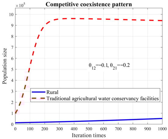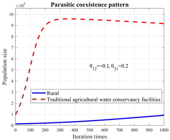 When , , this corresponds to , . The symbiosis coefficients are set as and . Figure 11 shows that the symbiotic relationship between rural areas and traditional agricultural water conservancy facilities exhibits asymmetric mutualism pattern.