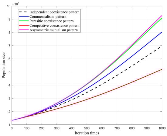 As shown in Table 2, the symbiosis coefficient influences the symbiotic relationship between the evolution paths of rural areas and agricultural water conservancy facilities. Therefore, this paper employs Matlab R2019b to simulate five symbiosis patterns. This study references the parameter settings outlined in relevant simulation literature [16,41], establishing the symbiotic interaction coefficient between rural areas and water conservancy facilities as = 0.1, and the symbiotic interaction coefficient from water conservancy facilities to rural areas as = 0.2. Based on the natural population growth rate data for 2019–2022 released by the Shou County People’s Government of Anhui Province, the irrigated area data benefiting from water conservancy facilities provided by the Shou County Water Resources Bureau, and historical records of the irrigated area benefiting from the Anfengtang documented in historical texts, the following parameters were established: initial population size, natural growth rates for villages and agricultural water conservancy facilities, maximum village development scale, and maximum irrigated area. This approach ensures that parameter settings are scientifically grounded and possess practical value to reference. Therefore, the natural growth rate of the rural population is set as r1 = 0.23%, and the natural growth rate of the irrigated area benefiting from water conservancy facilities is set as r2 = 2.4%. Based on the 2022 rural population data provided by the Shou County People’s Government and the beneficiary irrigation data from the Shou County Water Resources Bureau, the maximum rural development population is set as V1 = 132,745, and the maximum beneficiary irrigation capacity of agricultural water conservancy facilities is set as 980,000.