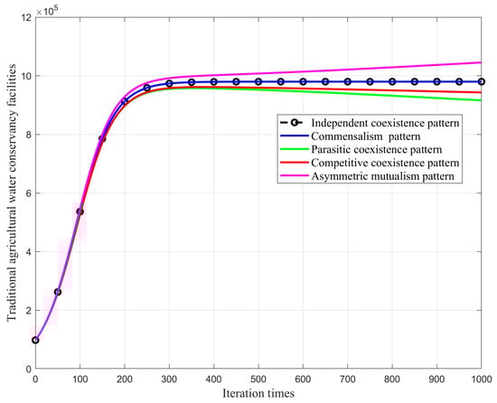 The results indicate that significant differences exist among the various symbiotic models. Among them, the mutualistic symbiosis model demonstrates optimal performance, with a steady state population of 92,874 in rural areas and an inflection point occurring at 896 iterations. Parasitic coexistence pattern and commensalism pattern follow, achieving steady-state populations of 91,034 and 80,329, respectively, while the independent symbiosis model yields a steady-state population of 69,741. Additionally, the competitive symbiosis model yielded the lowest value at 52,041, the overall ranking of population sizes is as follows: asymmetric mutualism pattern > parasitic coexistence pattern > commensalism pattern > independent coexistence pattern > competitive coexistence pattern (Figure 12). Regarding the irrigated area benefiting from agricultural water conservancy facilities, the reciprocal symbiosis model achieved the highest value at 1,045,359, while the parasitic symbiosis model yielded the lowest at 916,278. The ranking of symbiosis patterns by irrigated area was asymmetric mutualism pattern > independent coexistence pattern > commensalism pattern > competitive coexistence pattern > parasitic coexistence pattern (Figure 13). The results indicate that the symbiosis coefficient and the symbiotic evolution pathways between villages and traditional agricultural water conservancy facilities exert a determinant influence.