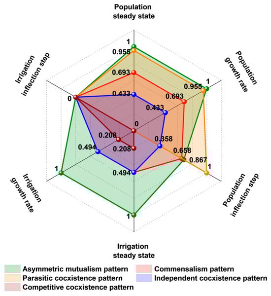 According to the normalized indicator data in Figure 14, the mutualistic symbiosis model exhibits the highest normalized values across all indicators. The parasitic symbiosis model ranks second in population steady-state values, with a value of 0.955. The population normalization value for the asymmetric mutualism pattern is 0.658, while the irrigation area is approximately 0.494. The competition pattern exhibits the lowest normalization value at 0. The steady-state value for the irrigation area is 0.208. The ranking of natural growth rates for rural populations was asymmetric mutualism pattern (1.000) > parasitic coexistence pattern (0.955) > commensalism pattern (0.693) > independent coexistence pattern (0.433) > competitive coexistence pattern (0.000). Analysis of the five coexistence patterns indicates that the mutualistic pattern is optimal for sustaining long-term stable coexistence between rural communities and water management systems. Therefore, enhancing rural investment in and management of water infrastructure, while promoting the establishment of positive feedback mechanisms, will enable the long-term sustainable development of both rural communities and traditional agricultural water facilities (Figure 14).