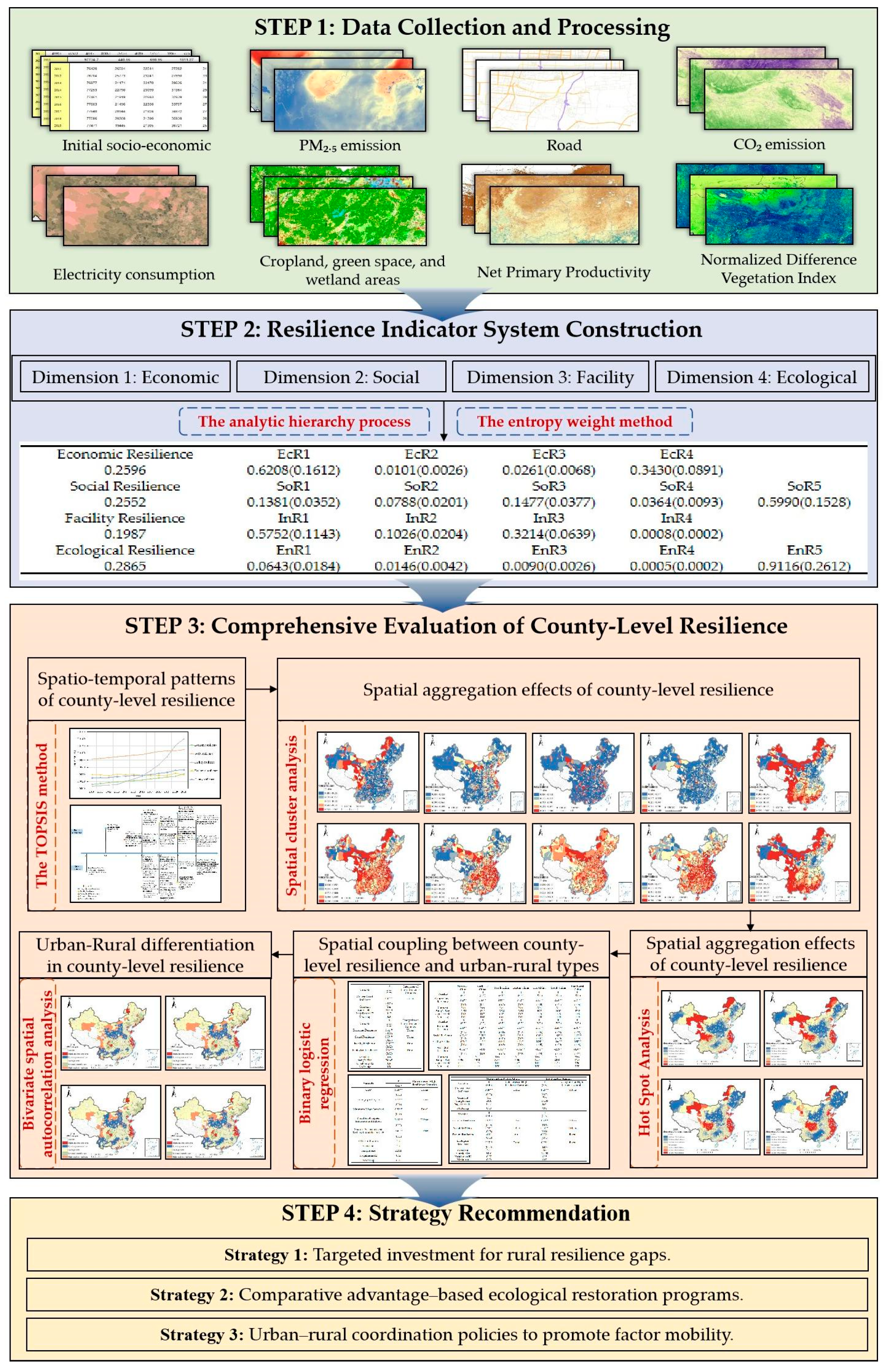 Therefore, county-level statistical and geospatial data are employed to systematically evaluate the development of resilience across Chinese counties from 2010 to 2021. The urban–rural disparities and spatiotemporal evolution of county-level resilience are further elucidated through multidimensional analysis encompassing resilience subsystems and geographical regions, thereby providing a scientific basis for the design of context-specific resilience strategies.