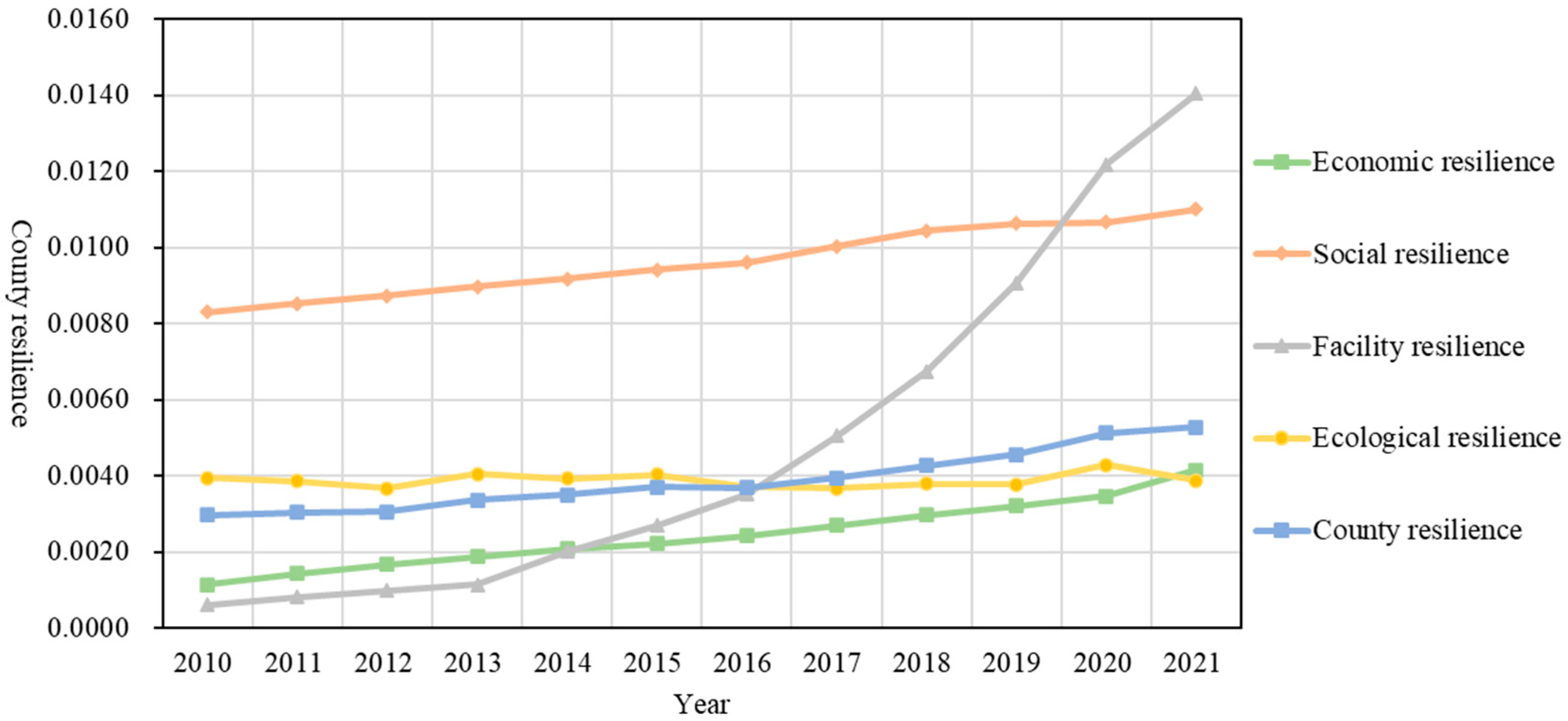 Specifically, social resilience displayed the largest standard deviation, which increased year by year. Although the standard deviation of facility resilience was relatively small in 2010, it grew rapidly thereafter. These patterns reflect significant disparities in social resilience among counties and a widening gap in facility resilience over time. In contrast, ecological resilience remained largely unchanged throughout the study period, showing the slowest growth. This stagnation may be explained by the encroachment on ecological spaces, which likely hindered improvements in ecological resilience [41].