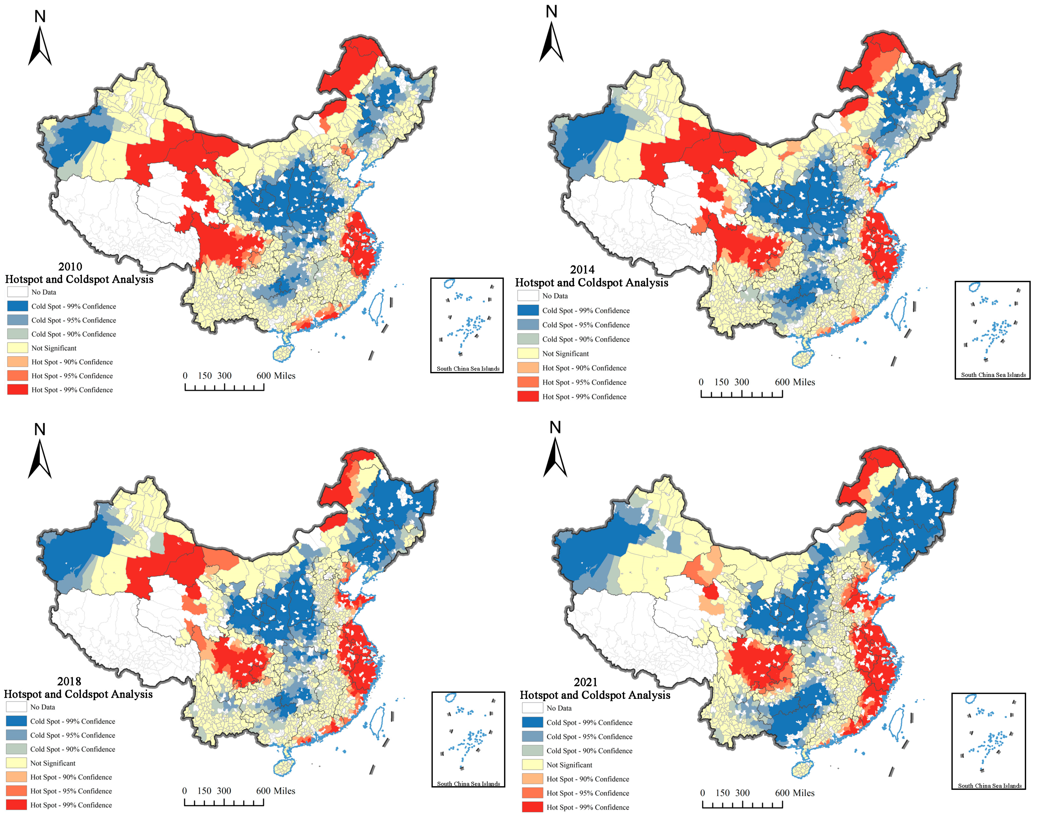 The Hot Spot Analysis tool in ArcGIS (version 10.2) was employed to identify spatial clusters of high and low resilience values at the county level. A higher Z-score indicates a statistically significant clustering of high resilience values, whereas a lower Z-score suggests significant spatial aggregation of low resilience values. The Getis-Ord statistic is defined as follows [38]: