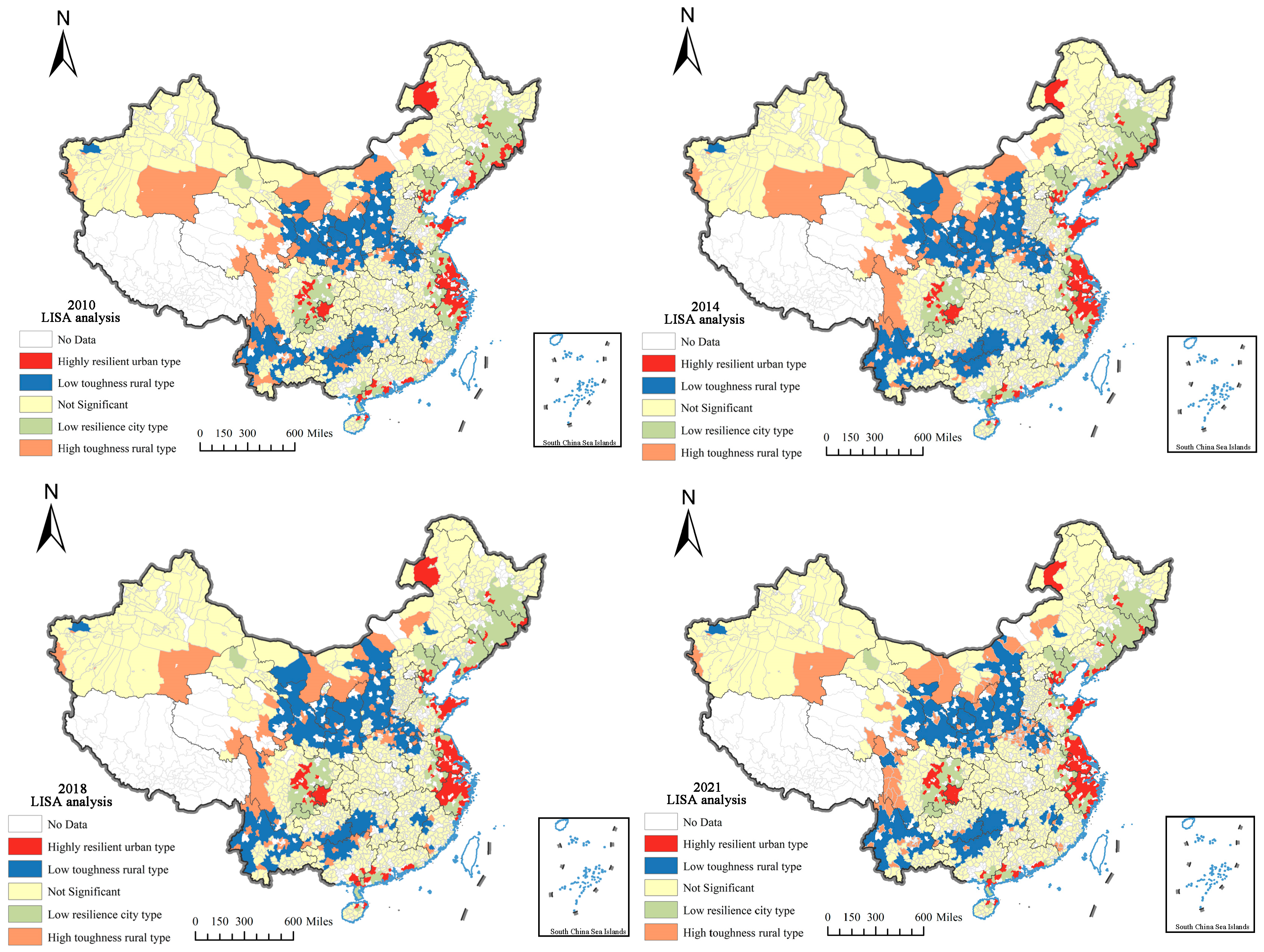 Figure 4 shows the quantile classification map of county-level resilience and its subsystem resilience. Regions such as the Greater Khingan Mountains, the eastern fringe of the Tarim Basin, and western Sichuan consistently demonstrated the highest resilience levels, likely benefiting from abundant natural resources. The most pronounced improvement was observed in the southeastern coastal areas, where higher socioeconomic development and an early transition toward intensive growth modes have facilitated more complete social infrastructure and environmental protection systems. In contrast, the Taklamakan Desert region remained consistently at the lowest resilience tier. Additionally, a contiguous zone spanning the border of northeastern China and eastern Inner Mongolia was predominantly classified within the second-lowest resilience category, highlighting these as critical areas for future policy intervention.
