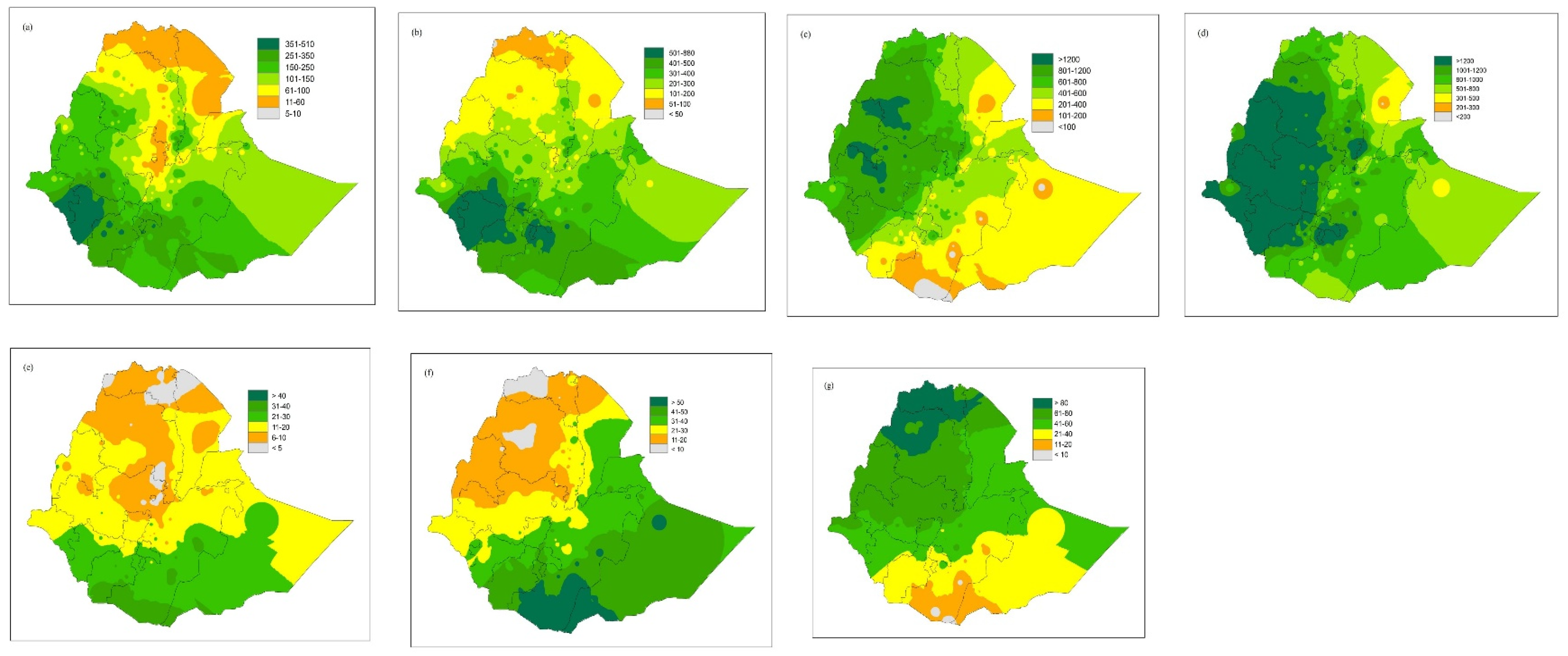 Figure 3. Spatial representation of mean seasonal rainfall and its contribution to annual rainfall totals in Ethiopia. (a) ONDJ, (b) FMAM, (c) JJAS, and (d) Annual mean rainfall (mm) and their contribution to the annual rainfall as depicted in (e) ONDJ, (f) FMAM, and (g) JJAS. These were created using data from 1991 to 2020.