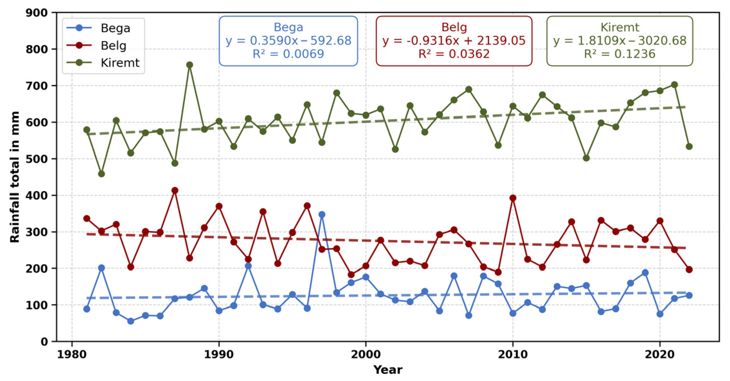 Figure 5. Rainfall trends for the Belg (February to May), Bega (October to December), and Kiremt (June to September) seasons. These are country level averages of gridded ENACTS rainfall data. The doted lines represent the trends.