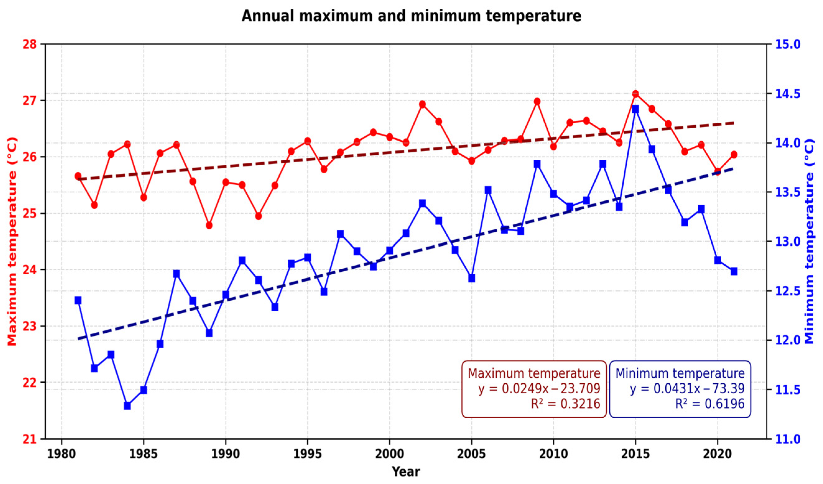 Like many other countries, Ethiopia is experiencing climate change–induced shifts in both temperature and rainfall. Figure 5 and Figure 6 present rainfall and temperature trends averaged over the entire country. Rainfall values are shown for the three main rainy seasons—Belg, Kiremt, and Bega—while temperature values are presented as annual averages. As expected, both minimum and maximum temperatures exhibit a gradual increase over the past forty years. Rainfall trends, however, vary by season: the Kiremt season shows a slight increase, whereas the Belg season indicates a decreasing trend. These patterns also exhibit substantial spatiotemporal variability, with both increasing and decreasing trends reported depending on the specific region and time period under analysis [50].