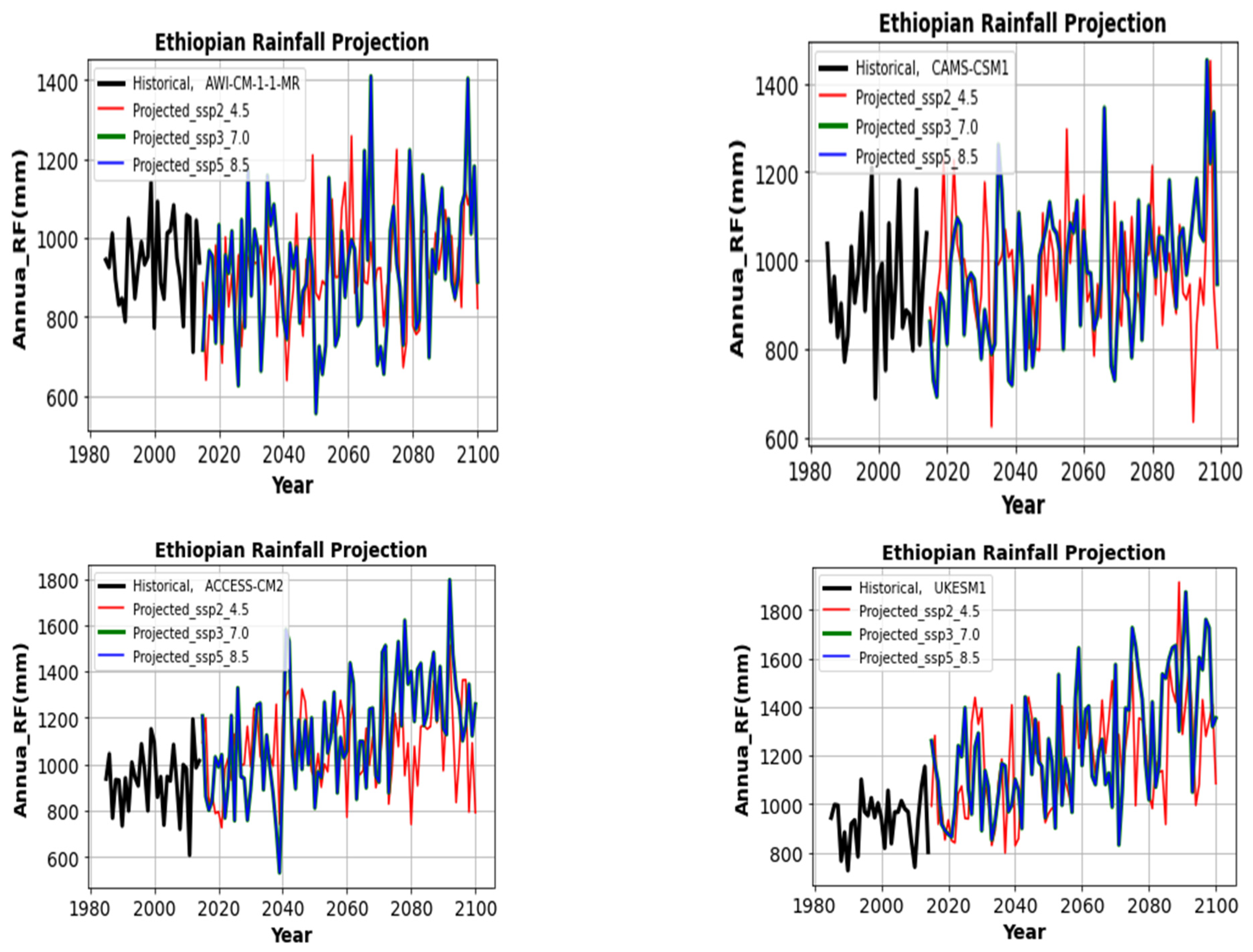 A multi-model comparison of short-term annual rainfall projections for Ethiopia was conducted, incorporating both historical data and future climate scenarios under different SSPs and Representative Concentration Pathways (RCPs). The findings of this comparison are summarized in Table 2 and illustrated in Figure 7 below.