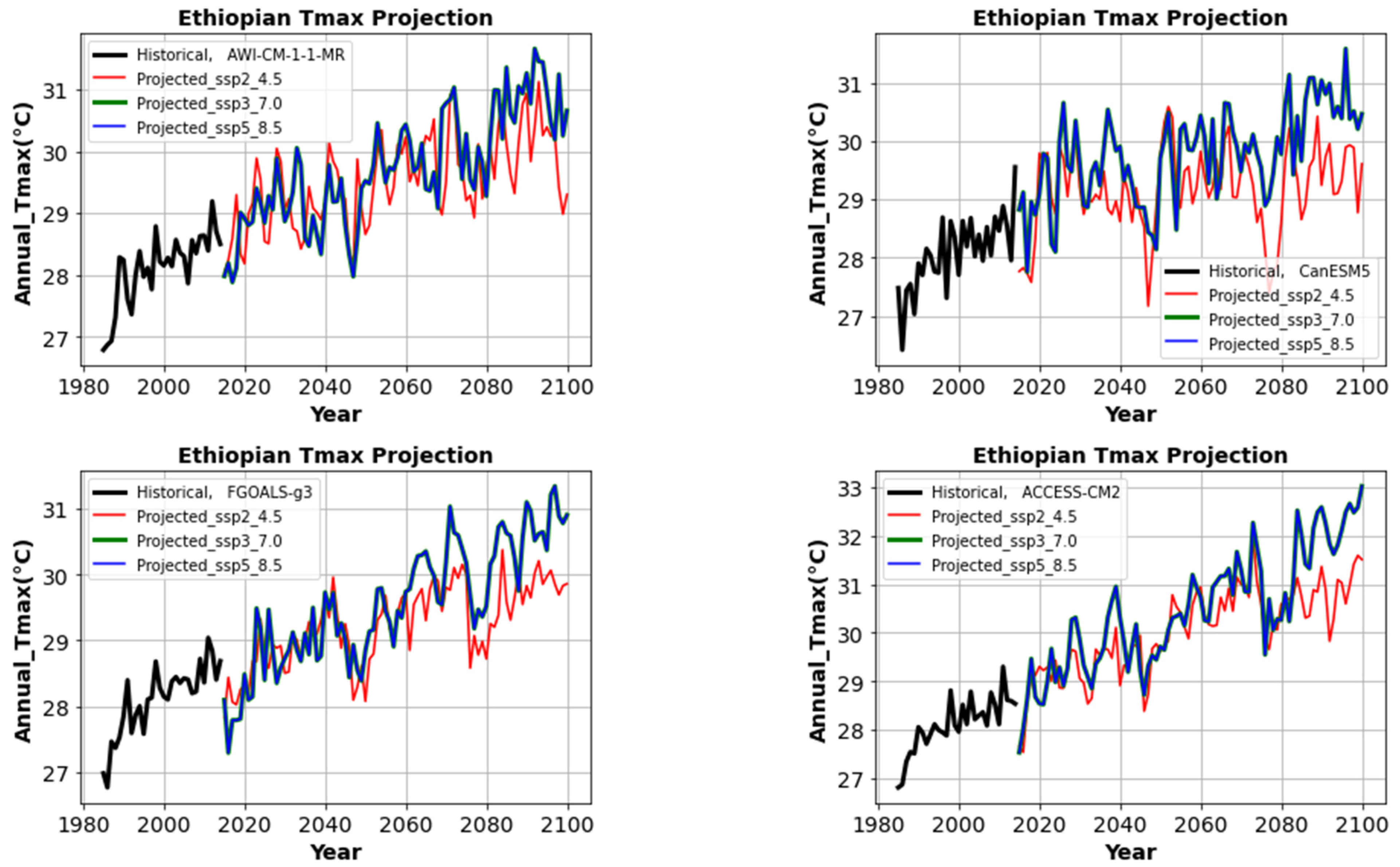 The mean annual temperature has been increasing at a rate of about 0.2 °C to 0.28 °C per decade. Future climate projections indicate a continued rise in temperature, with an expected increase ranging from 0.5 °C to 2.2 °C by the 2050s compared to current levels [52,53]. To illustrate future temperature trends over Ethiopia, projections of annual maximum and minimum temperatures (Tmax and Tmin) were developed for the period 1985 to 2100. These projections were compared with historical data under three Shared Socioeconomic Pathways (SSPs) and their corresponding Representative Concentration Pathways (RCPs). The analysis is based on outputs from four global climate models: AWI-CM-1-1-MR, FGOALS-g3, CanESM5, and ACCESS-CM2. The results are summarized in Table 3 and Figure 8.