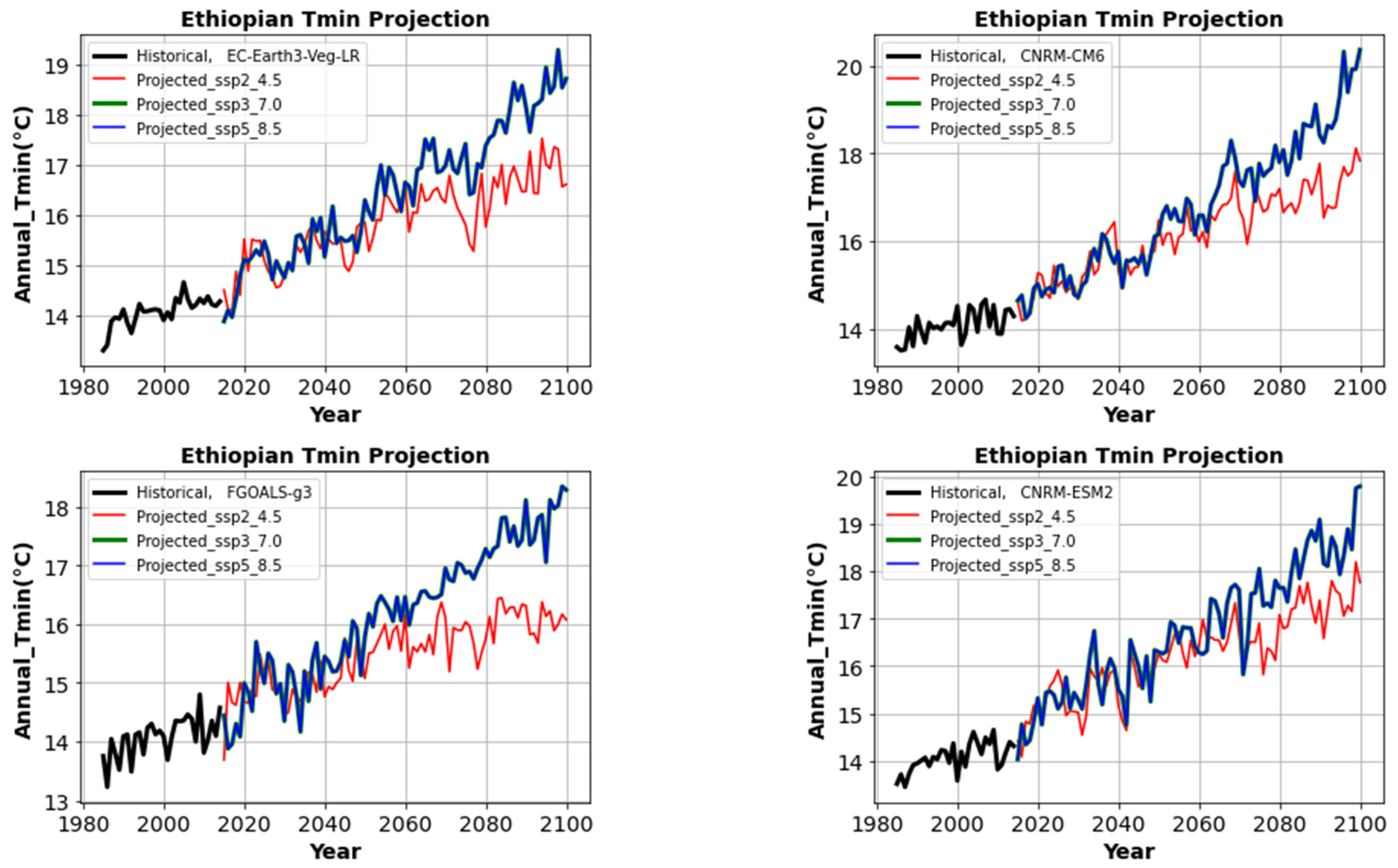 Figure 9. Historical and future minimum temperature trend using four models that participated in CMIP6 data from 1980–2100.