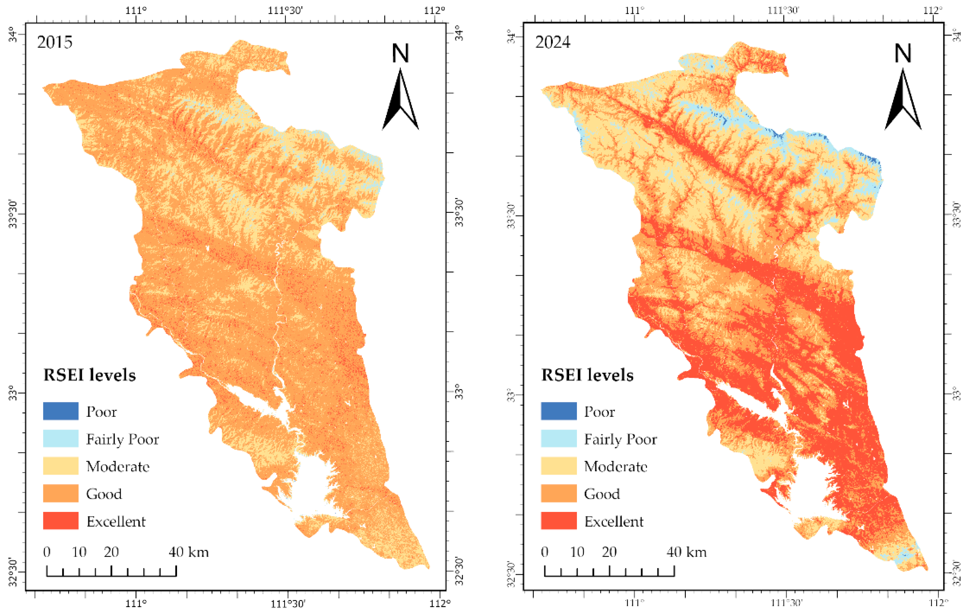 - Ye, H.; Huang, J.; Xu, Y. Evaluation of ecological quality in Huangshi City based on an improved remote sensing ecological index. Environ. Sci. Technol. 2025, 48, 211–224. [Google Scholar] [CrossRef]
