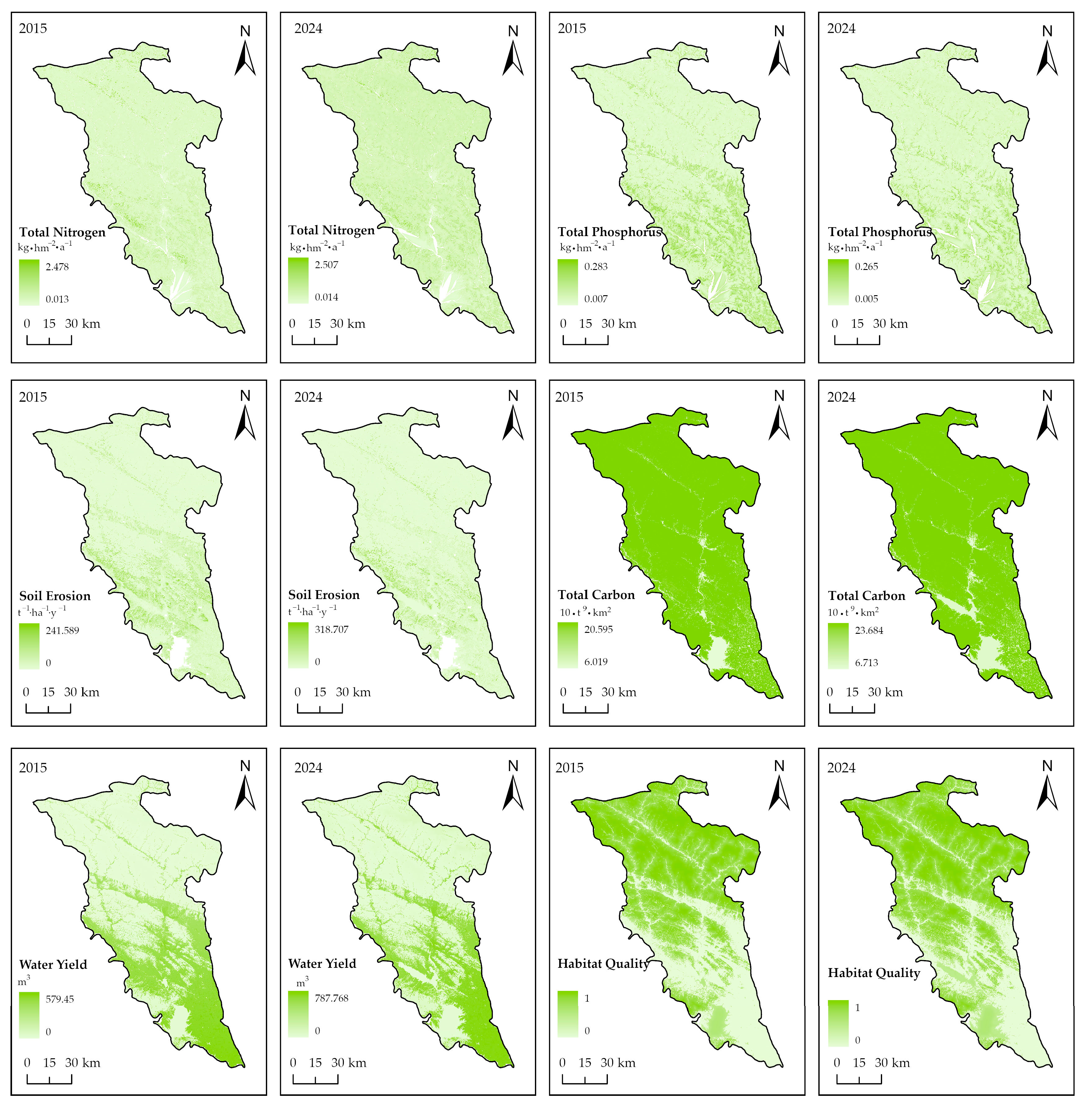 - Gao, W.; Song, Q.; Zhang, H.; Wang, S.; Du, J. Analysis of Changes in Supply and Demand of Ecosystem Services in the Sanjiangyuan Region and the Main Driving Factors from 2000 to 2020. Land 2025, 14, 1427. [Google Scholar] [CrossRef]