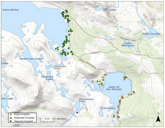 Lake Aloha (LA) is the most accessible and heavily visited alpine lake basin (Figure 1) at an elevation of 2474 m, located in the shadow of Pyramid Peak, at 3043 m, the highest peak in the wilderness. Considering its proximity to a major trailhead and the PCT and TRT running through it, Aloha is regularly accessed by Desolation Wilderness day hikers, backpackers, and long-distance backpackers. The exceptionally rocky terrain in this lake basin limits the sizes of campsites (mean size of 46 m2), but campsite proliferation has been a chronic and significant problem, with USFS campsite monitoring surveys documenting 146 campsites and an aggregate area of campsite impact of 6680 m2 [31]. The USFS employs a dispersed camping strategy for this lake basin, requesting visitors to select any location for camping that is greater than 30 m from the lake (40 of 52 campsites in this study violate this voluntary guidance). Our study area was restricted to the southern half of this lake basin due to its large size and numbers of campsites (Figure 1).