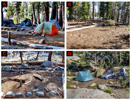 6. Cole, D. Campsites in Three Western Wildernesses: Proliferation and Changes in Condition Over 12 to 16 Years; USDA Forest Service Res. Pap. INT-463; Intermountain Forest & Range Experiment Station: Ogden, UT, USA, 1993.