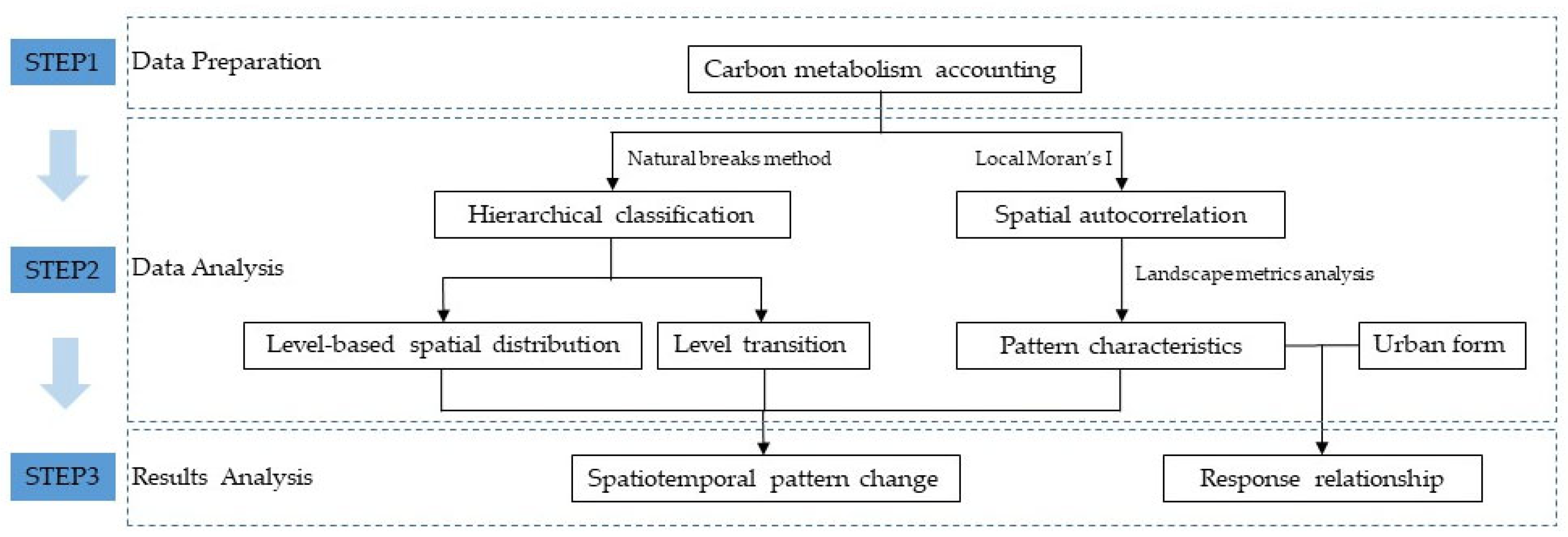 The research process contains three main steps (Figure 2). First, during the data preparation phase, the carbon emissions and carbon sequestration of each land-use type in Haikou were calculated. Second, the evolution of urban carbon metabolism and form was analyzed using GIS spatial analysis, spatial autocorrelation analysis, and landscape metrics. Finally, the results were interpreted in light of Haikou’s relevant urban planning and studies, providing insights for low-carbon urban planning.