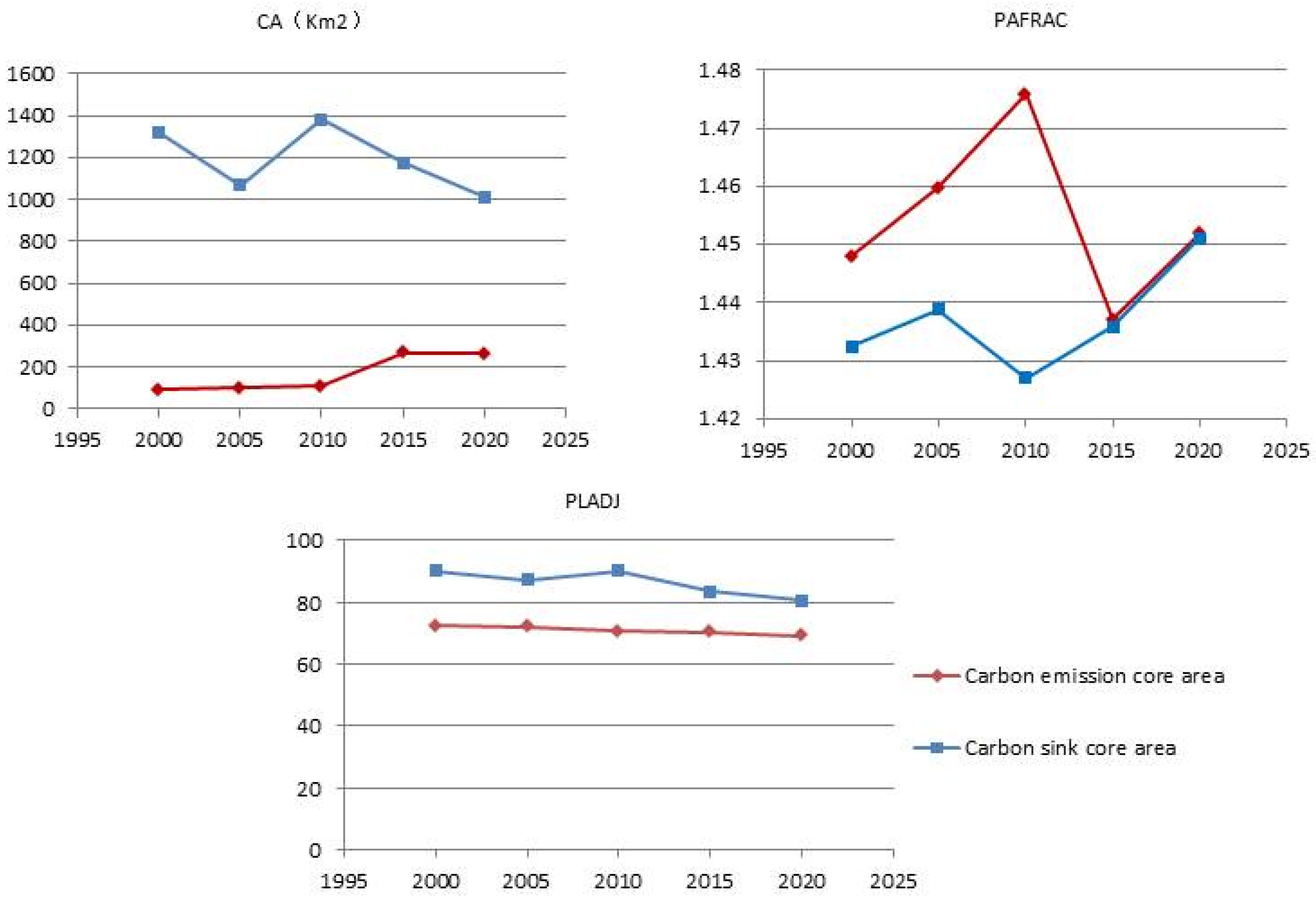 In contrast, the carbon sink core zone exhibited a negative correlation between morphological complexity and area expansion—when the area increased, the PAFRAC index decreased, and vice versa. The PLADJ index showed a similar inverse relationship, likely due to the fragmentation process of ecological land in this zone.