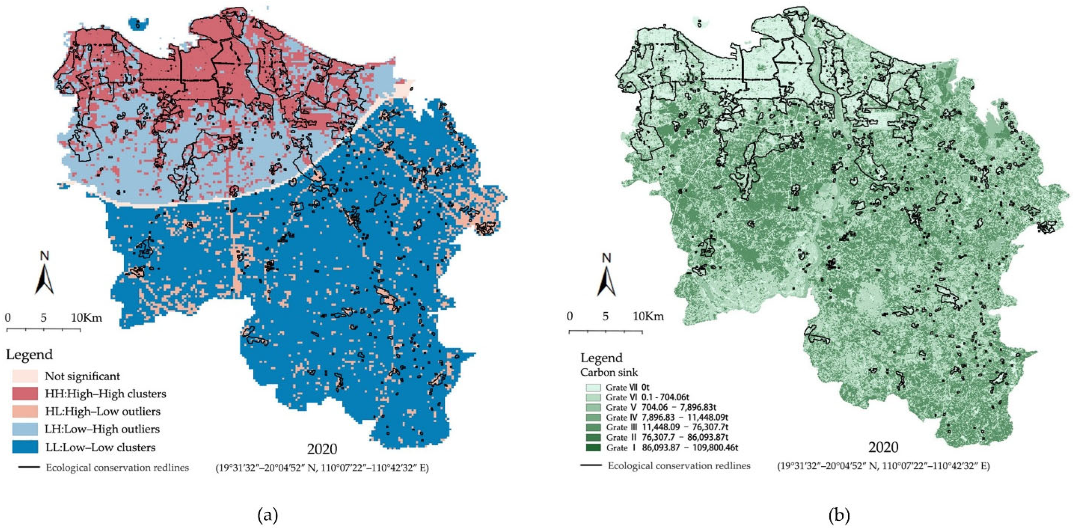 Figure 14. (a) Ecological conservation redlines and spatial autocorrelation patterns of carbon sink; (b) Ecological conservation redlines and carbon sink distribution map. HH: High–High clusters; HL: High–Low outliers; LH: Low–High outliers; LL: Low–Low clusters. This figure was created based on the standard map of Haikou City obtained from the National Platform for Common Geospatial Information Services.