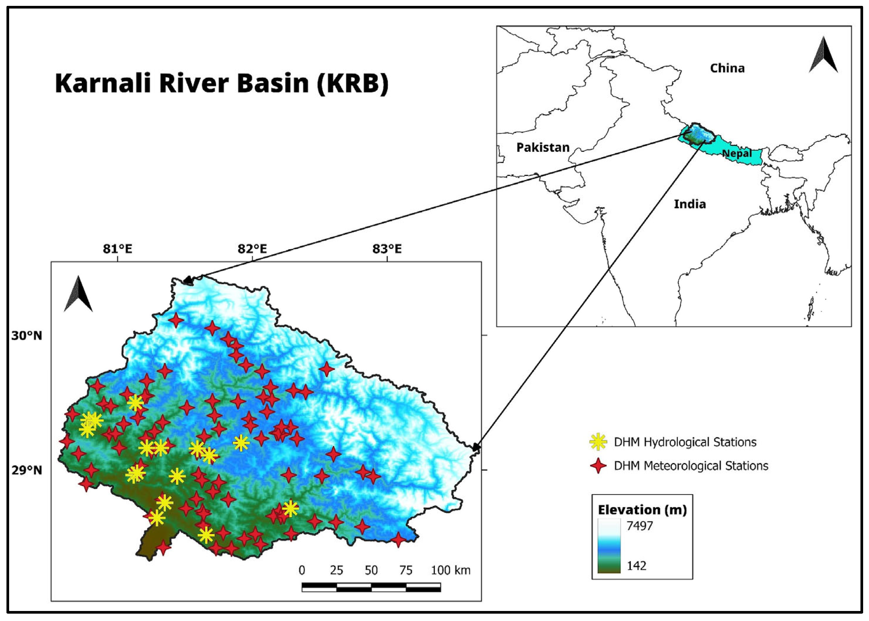 - Khatiwada, K.R.; Panthi, J.; Shrestha, M.L.; Nepal, S. Hydro-Climatic Variability in the Karnali River Basin of Nepal Himalaya. Climate 2016, 4, 17. [Google Scholar] [CrossRef]