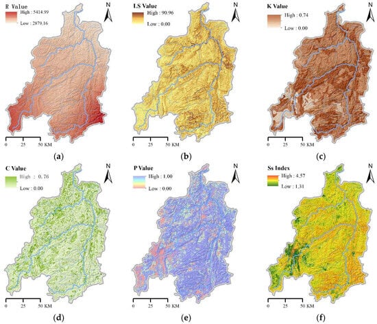Distribution maps of RUSLE-related factors and the soil erosion susceptibility index. Following the RUSLE framework, erosion-related factors were quantified and spatially represented using GIS analysis. The geographical variation of each factor is illustrated as follows: (a) R factor (rainfall erosivity); (b) LS factor; (c) K factor (soil erodibility); (d) C factor (cover management); (e) P factor (conservation practices); (f) SS factor.