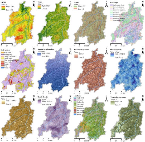 To better capture the multifaceted drivers of soil erosion in karst ecological zones, twelve explanatory variables were incorporated into the machine learning analysis, representing lithology, terrain, soil properties, rainfall, hydrological conditions, and human activities. The spatial distribution of these factors—lithology, elevation, slope, aspect, soil texture, annual rainfall, distance to rivers, river density, distance to roads, road density, land use type, and vegetation coverage—is presented in Figure 5, offering a comprehensive representation of environmental variability within the study region.