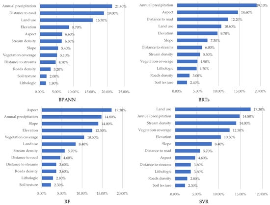 In the BPANN model, the most influential factors contributing to soil erosion susceptibility are annual precipitation (21.40%), distance to roads (19.00%), land use (15.70%), and elevation (8.70%). The BRTs model also identified annual precipitation (19.10%) as the most critical factor, with aspect (14.60%), distance to roads (12.20%), and land use type (10.60%) being secondary. In contrast, the RF model prioritized aspect (17.30%) above annual precipitation (14.80%), slope (14.00%), and stream density (12.50%). For the Support Vector Regression (SVR) model, land use ranks highest in importance (15.00%), followed by annual precipitation (13.20%), stream density (10.90%), and vegetation coverage (10.70%).