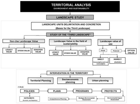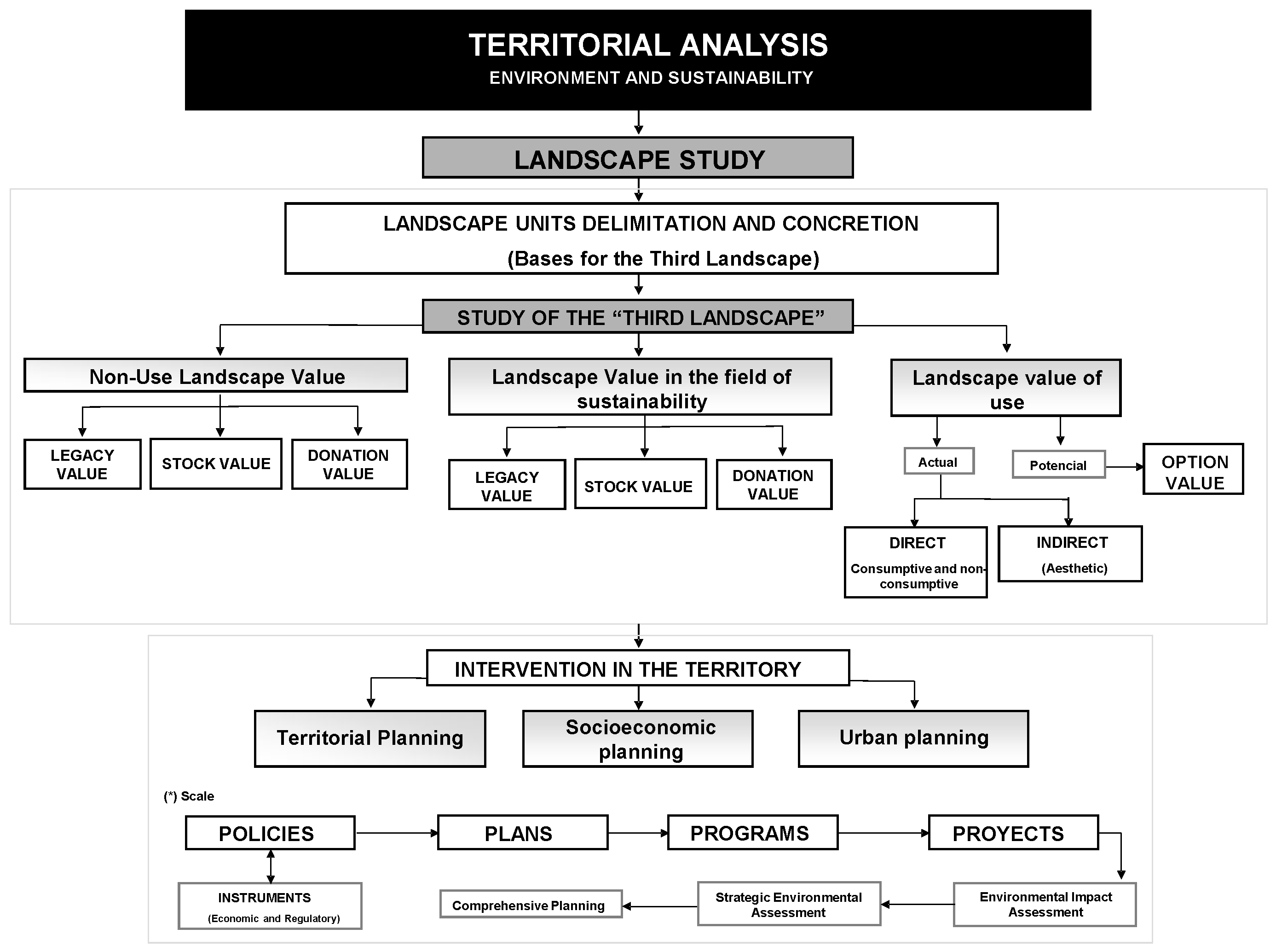 In this way, it becomes essential to link and interpret the territorial planning procedures of so-called “geographic spaces”—where elements of the physical environment, the human environment, the economic environment, political processes, legal implications, etc., converge—in the arduous task of understanding the environment, in general, and environmental sustainability processes, in particular. This is a question of considerable complexity given the broad and varied interpretation of the landscape, as well as its interpretative modus operandi, a product, on the one hand, of the conception of the landscape as the medium or environment and, on the other, of what has been termed “visual landscape”, which refers exclusively to its aesthetic or artistic value. This has given rise, in this way, to a joint entity between space and the perception of territory, where spatial reality is contemplated and considered by the human being, just as they perceive it.