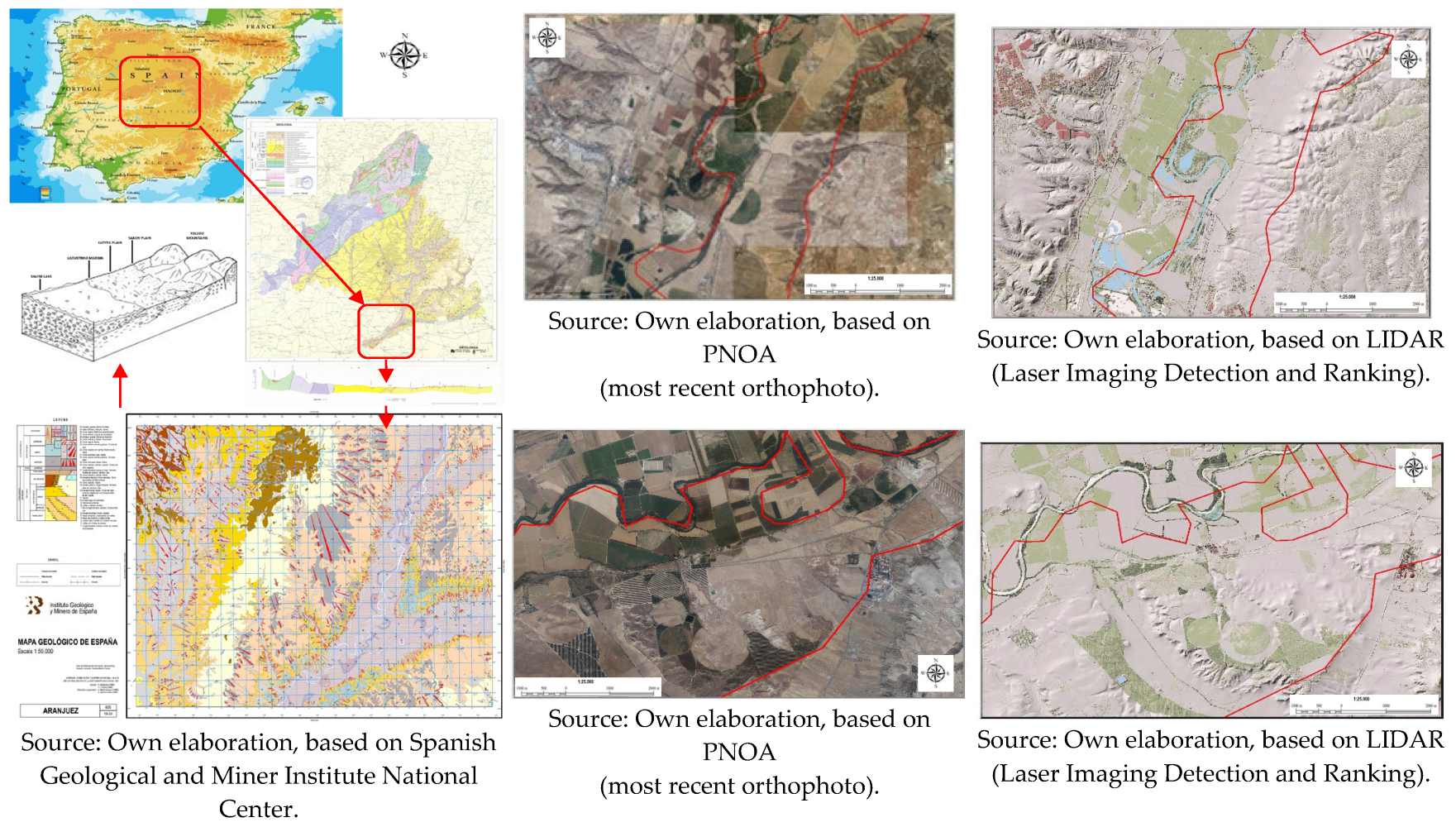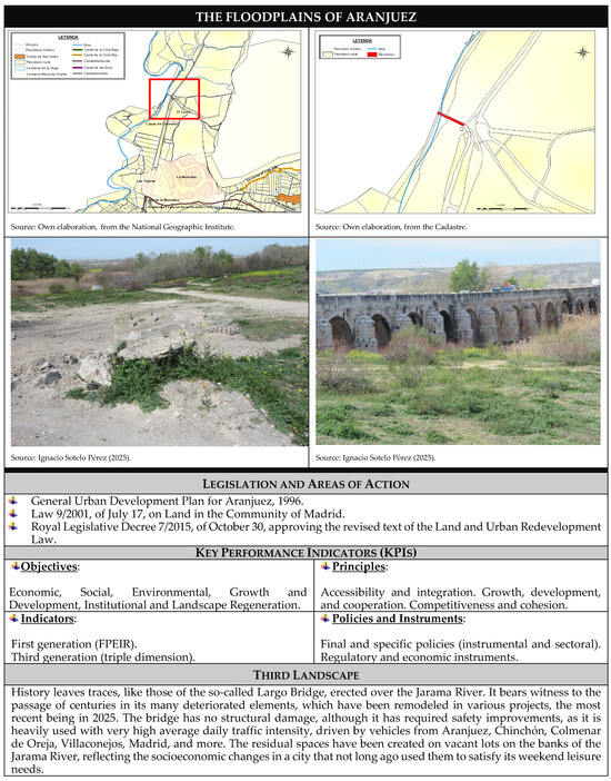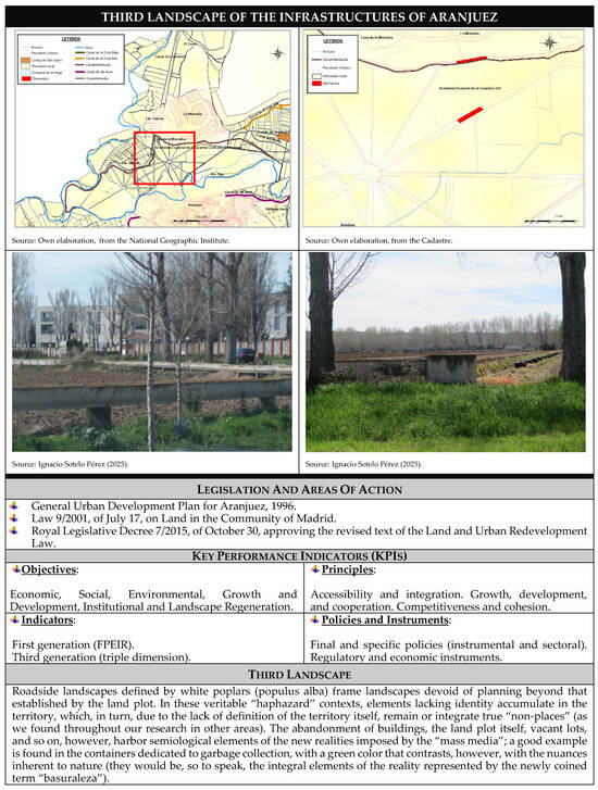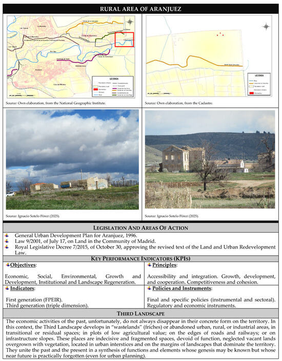 In this way, in order to analyze, assess, and interpret the reality of the “Third Landscape” in the Aranjuez area, it is necessary to understand the geographic space underlying the landscape of the study area. Therefore, this methodology proposes the application of an instrumental basis (quantitative and/or qualitative, as appropriate) that allows for the specification of the landscape units that encompass the so-called “Third Landscape”. Thus, the attached table emphasizes the need to break down the landscape base around the “Non-Use Landscape Value,” which refers to the appreciation that a person or society gives to a landscape simply for its existence, without the need to interact directly with it, that is, a type of intangible value, linked to conservation, cultural identity, and environmental legacy, that includes legacy value, based on the interest in preserving it for future generations; donation value, which shows the value that a person feels when contributing to the conservation of a landscape, even if they do not use it or see it directly; and stock value, which includes the desire for a landscape to continue existing, even if it is never visited. On the other hand, the study of the “Third Landscape” in Aranjuez has been addressed based on the knowledge of “Landscape Value in the Field of Sustainability”, that is, analyzing how the landscapes of Aranjuez contribute to the ecological, economic, and social well-being of the territory, beyond their aesthetic or economic value, integrating the criteria of conservation, resilience, and intergenerational equity. Similarly, and more practically, emphasis has been placed on the “Landscape Use Value”, both current and potential, addressing the direct (consumptive or not), indirect (aesthetic), or optional value of the areas in the territory under study. Our aim is to analyze the value that landscapes or natural environments have for people, not only for what they produce or generate economically but also for how they influence the quality of life of the population (physical and mental health, cultural identity, education and knowledge, aesthetics and enjoyment, etc.). All of this, together with the extensive knowledge of the physical, human, and economic environment, lays the foundations for territorial intervention in the processes of territorial planning, socioeconomic planning, and urban planning, through policies (which define the general framework for action that defines principles, objectives, and priorities on which planning policies are based, whether finalists, specific, sectoral, instrumental, etc.), plans (as a strategic document that organizes actions to comply with a policy), programs (including the set of coordinated actions within a plan, with specific objectives), and projects (which encompass specific action, with defined resources, that executes part of a program). Finally, the methodological analysis uses Key Performance Indicators to analyze the “Third Landscape”, which allows for the objective measurement and/or assessment of the impact, evolution, and value of marginal or residual spaces in a territory, integrating them into sustainability, environmental management, and urban planning strategies, in general, and their application to the study area, in particular.