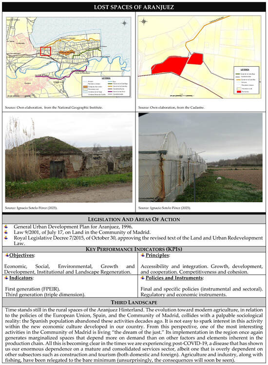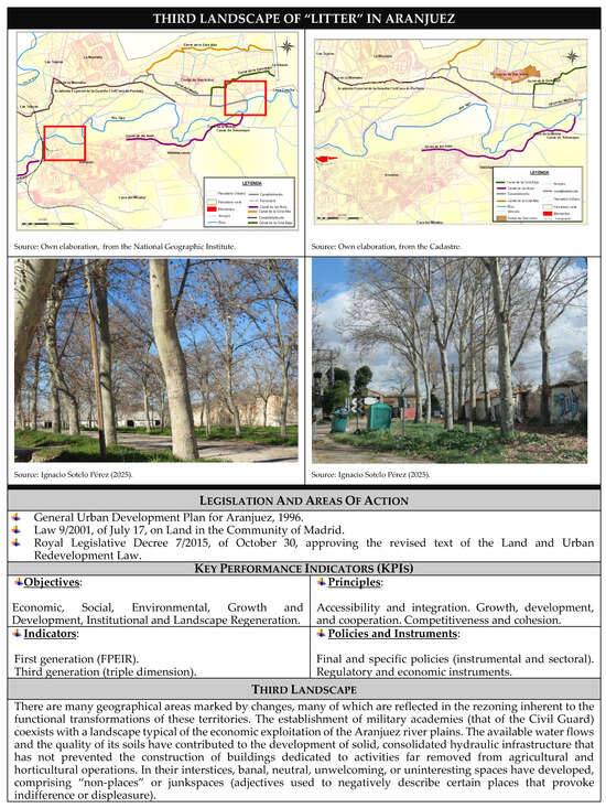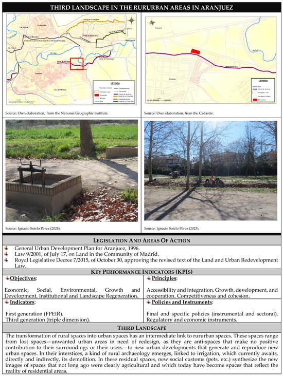 The present research aims to analyze, assess, and interpret the territorial reality of the south of the Community of Madrid, with the case study of Aranjuez, revealing the interrelationship between urban growth, its link with the mechanisms that operate in the real estate sector, the processes of transformation of rural areas into spaces where rurbanization and marginal urbanization related to the reclassification of land (generally rural) prevail, based on the application of a novel interpretive methodology of the so-called “Third Landscape”, based on the “Key Performance Indicators (KPIs)”, applied to formal, socioeconomic, functional, environmental paradigms, among others. Thus, throughout the study, we address the Third Landscape and elements such as Lost Spaces, Garbage Spaces, Shadow Places, etc., in short, vacant lots or residual spaces (formless and unused anti-spaces), which are framed around the conceptualization of the Third Landscape, of that of no man’s land, which no one uses, whose maintenance is unknown, and which currently predominates in the rural and rururban world of Aranjuez. With all this, the motivation for the research and, therefore, its results, is based on the knowledge of the regeneration and adaptation of the nature of the study area in marginal and unplanned spaces—such as roadside ditches, vacant lots, and urban interstices—promoting the foundations for future territorial development models, as well as territorial planning processes that allow for urban regeneration, ecological design, and the socioeconomic enhancement of a city in expansion and transformation.