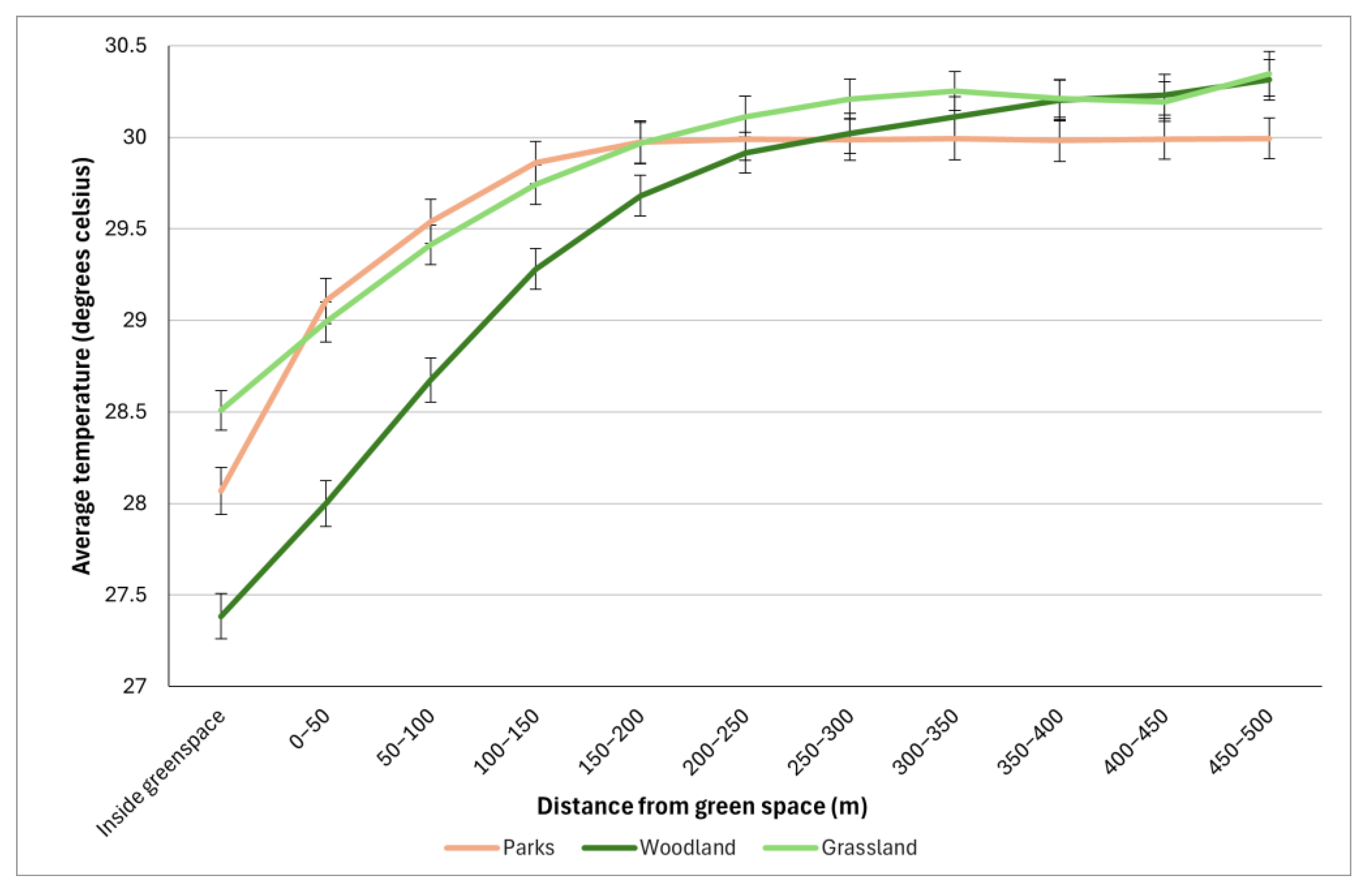 10]. In cities in temperate climate zones, regarding air temperature reduction, a study monitored the cooling effects of eight green spaces in London, found that, on average, small green spaces (ranging from 0.8 to 3.8 ha) cooled the surrounding area by 0.4 to 0.8 °C of nocturnal air temperature over a distance of approximately 30–120 m beyond their boundaries. Medium-sized green spaces (ranging from 10.1 to 12.1 ha) cooled the surrounding area by 0.6 to 1.0 °C over approximately 180–330 m [