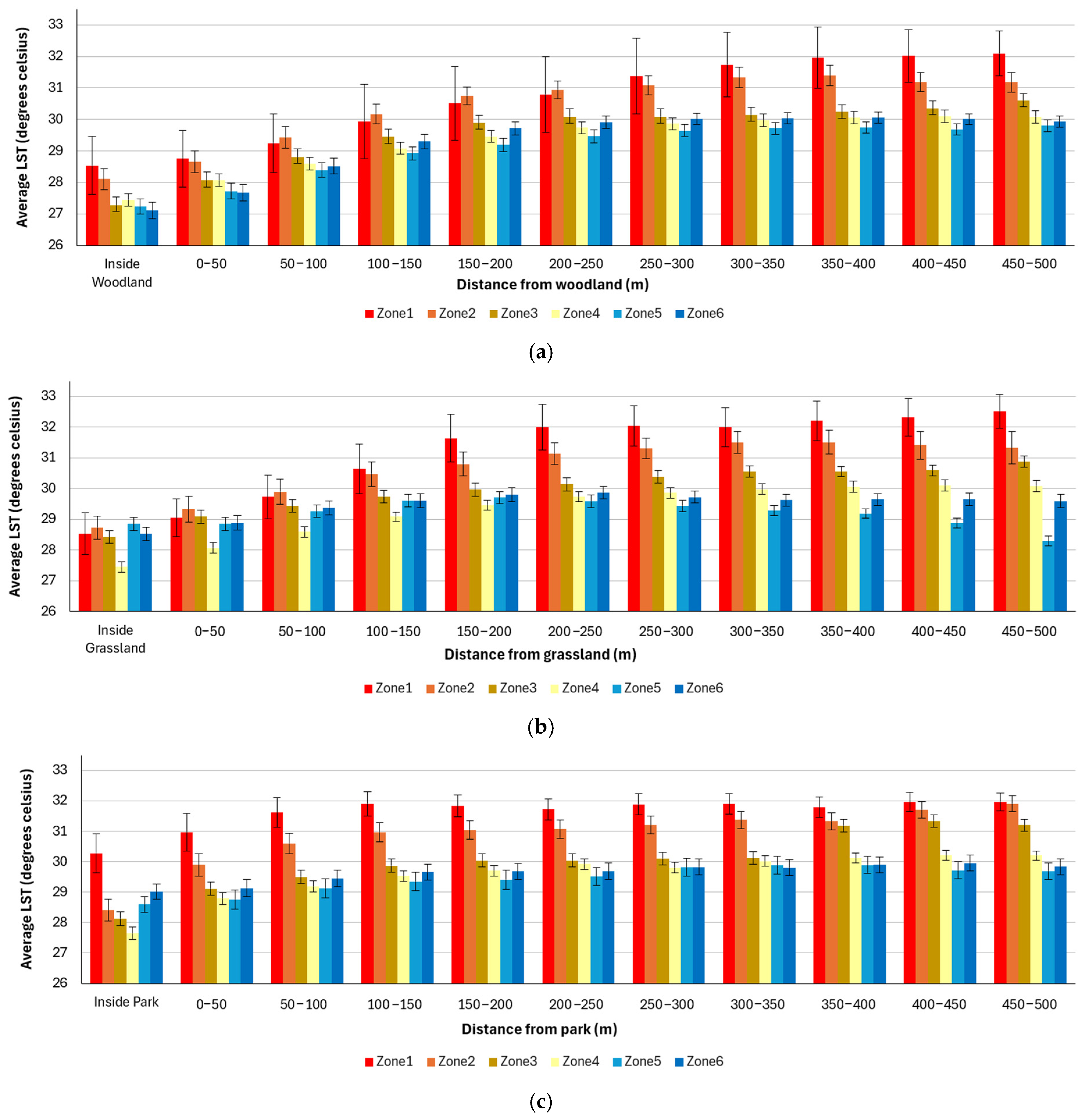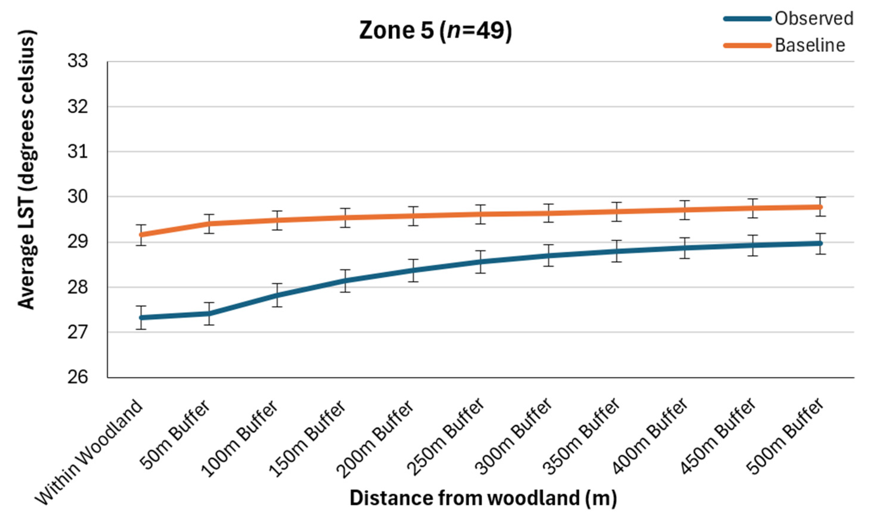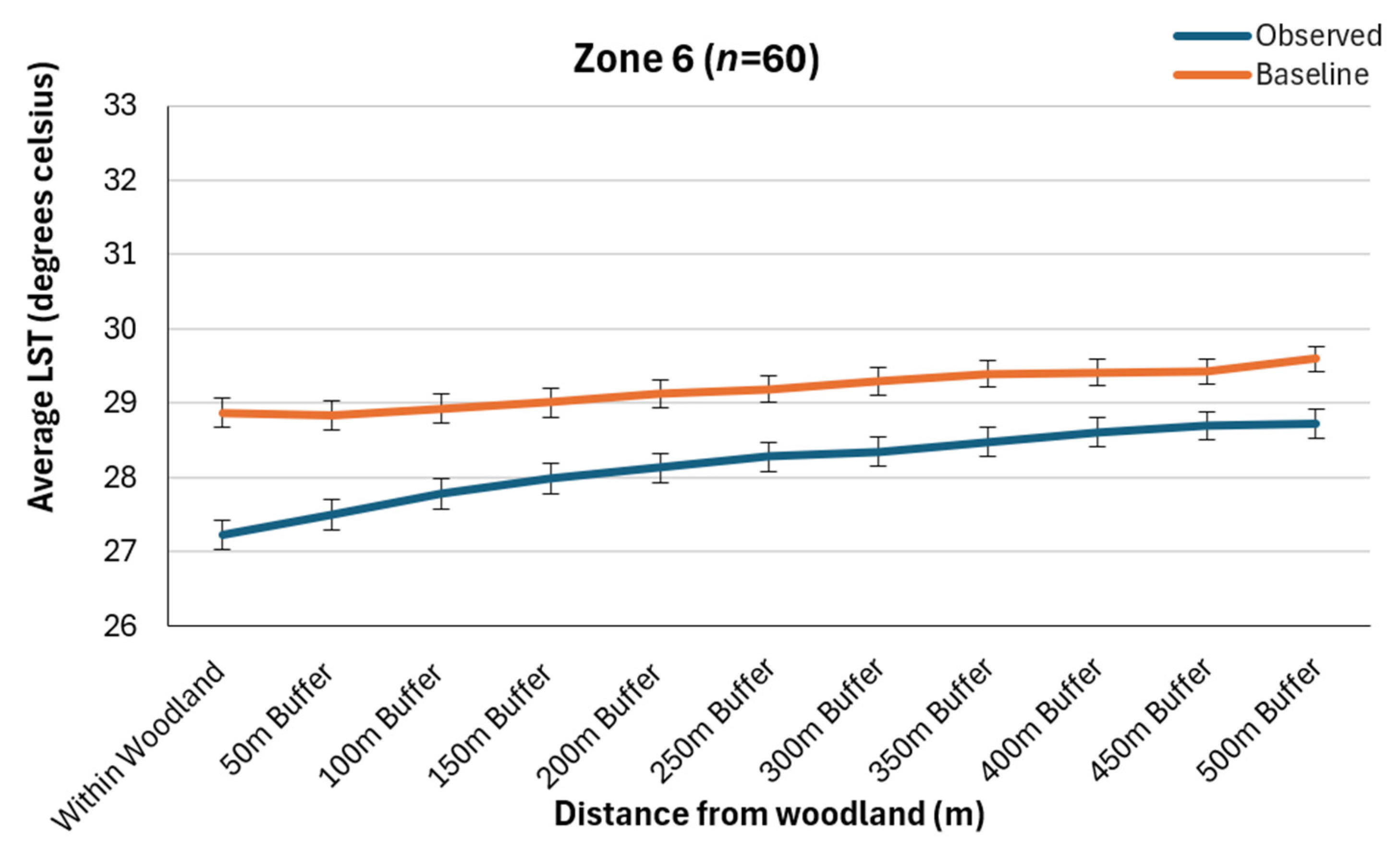 20]. Remote sensing studies have observed reductions in LST ranging from 1.9 to 6.7 °C over 60–120 m spatial footprints [
