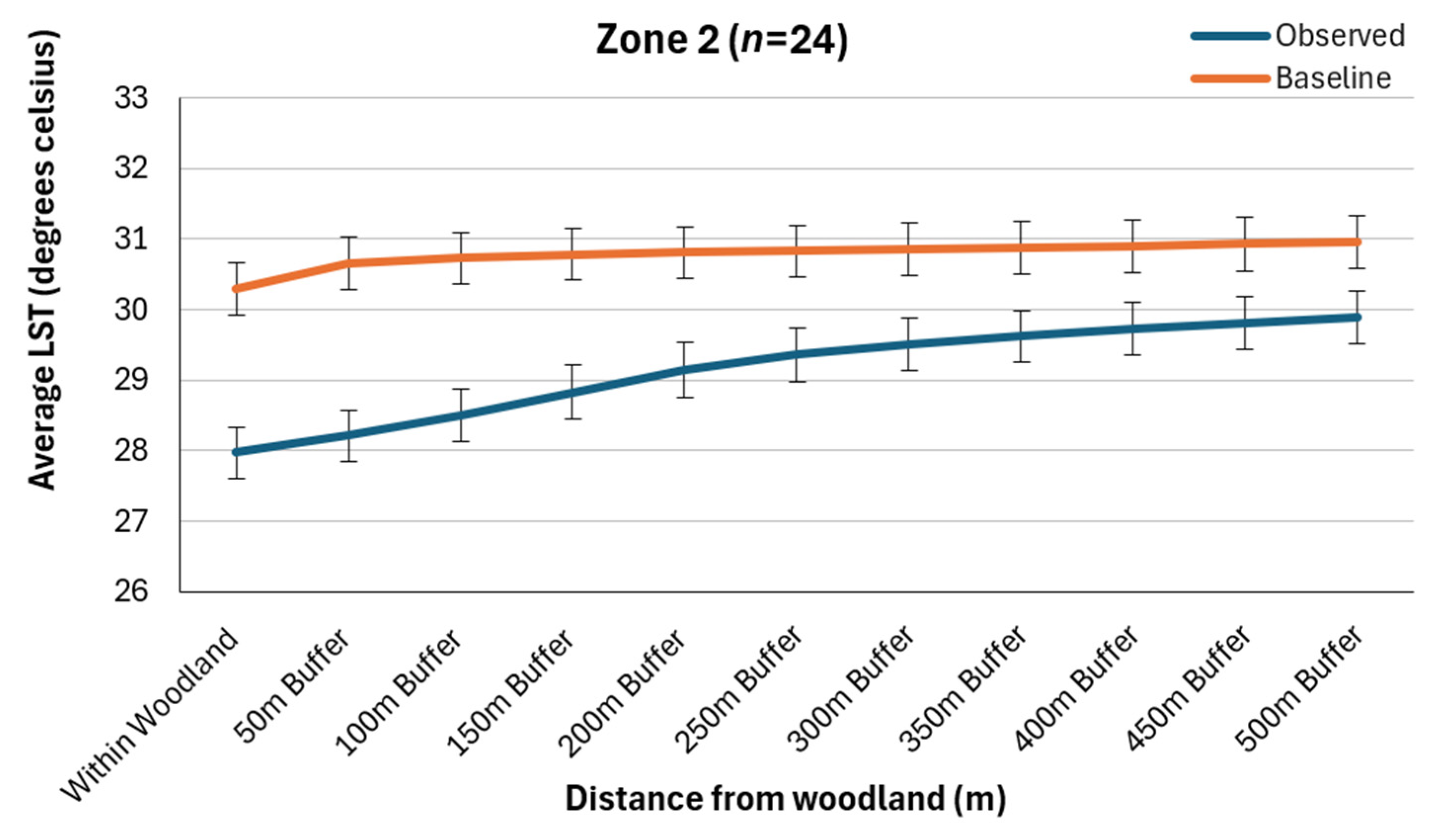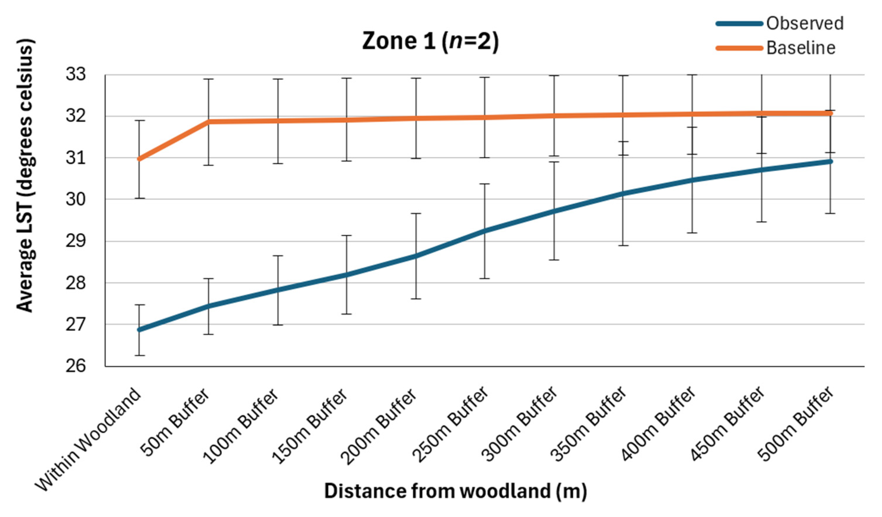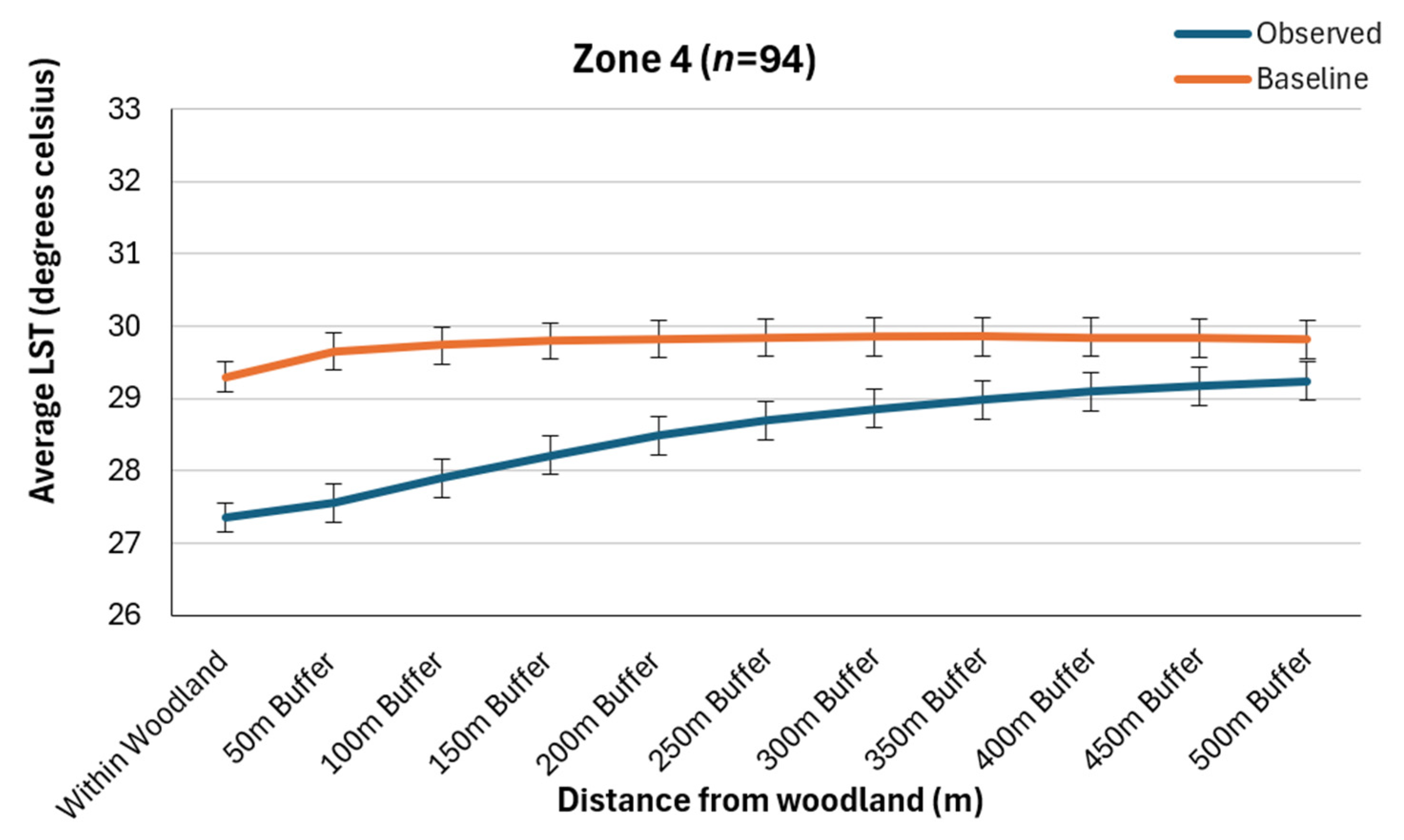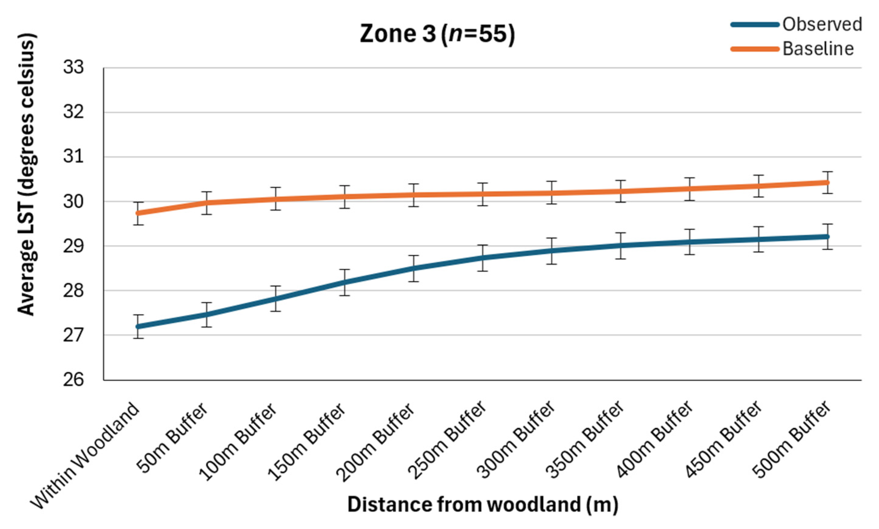 20]. Remote sensing studies have observed reductions in LST ranging from 1.9 to 6.7 °C over 60–120 m spatial footprints [