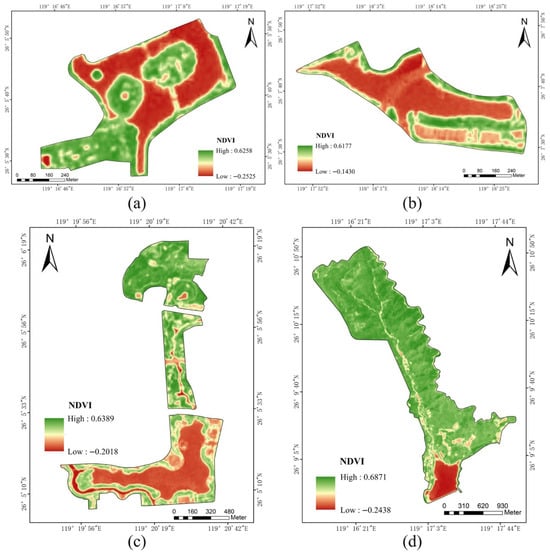 NDVI Results Map: (a) Xihu Park; (b) Qinting Park; (c) Jinan Park; (d) Fuzhou National Forest Park.