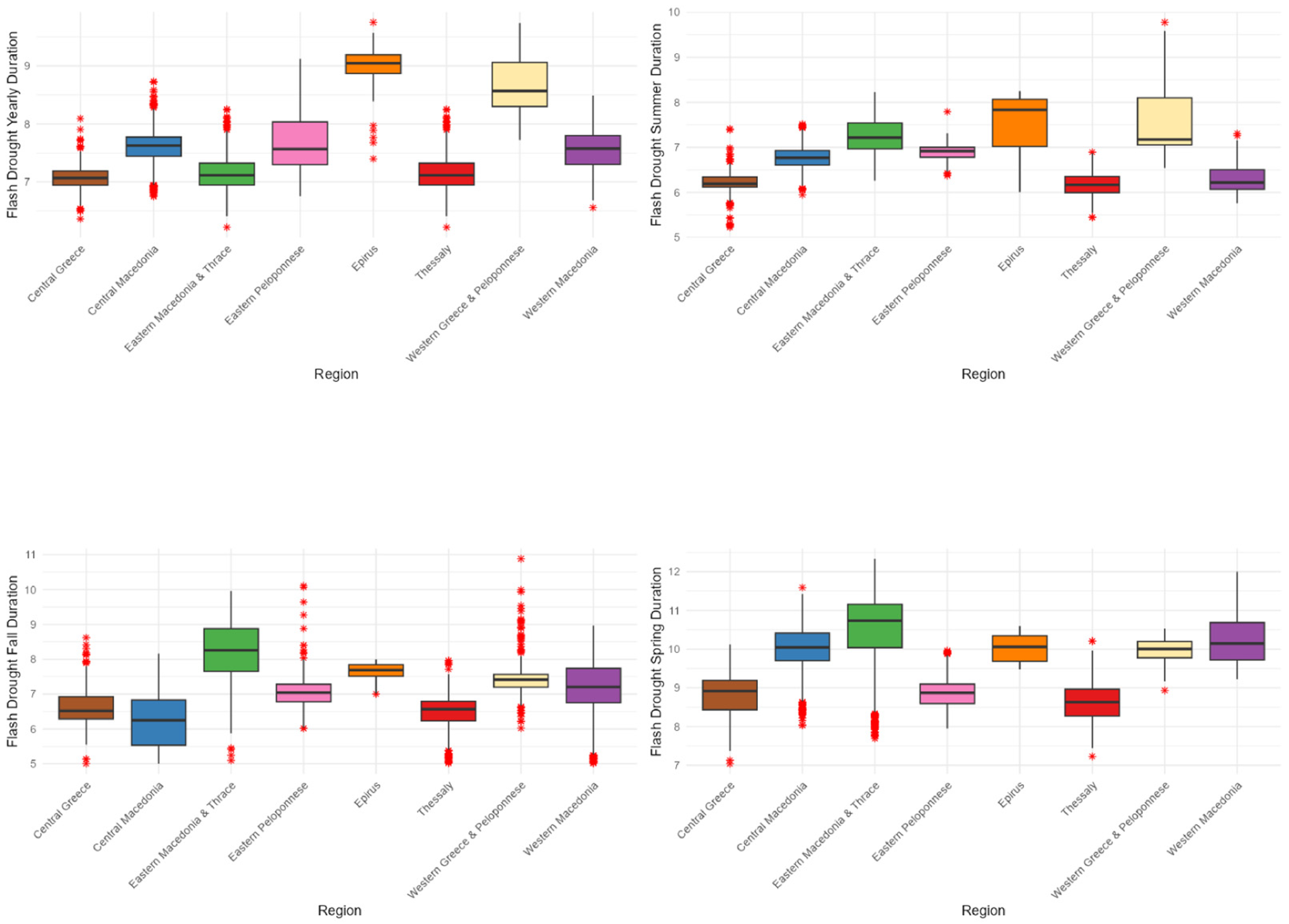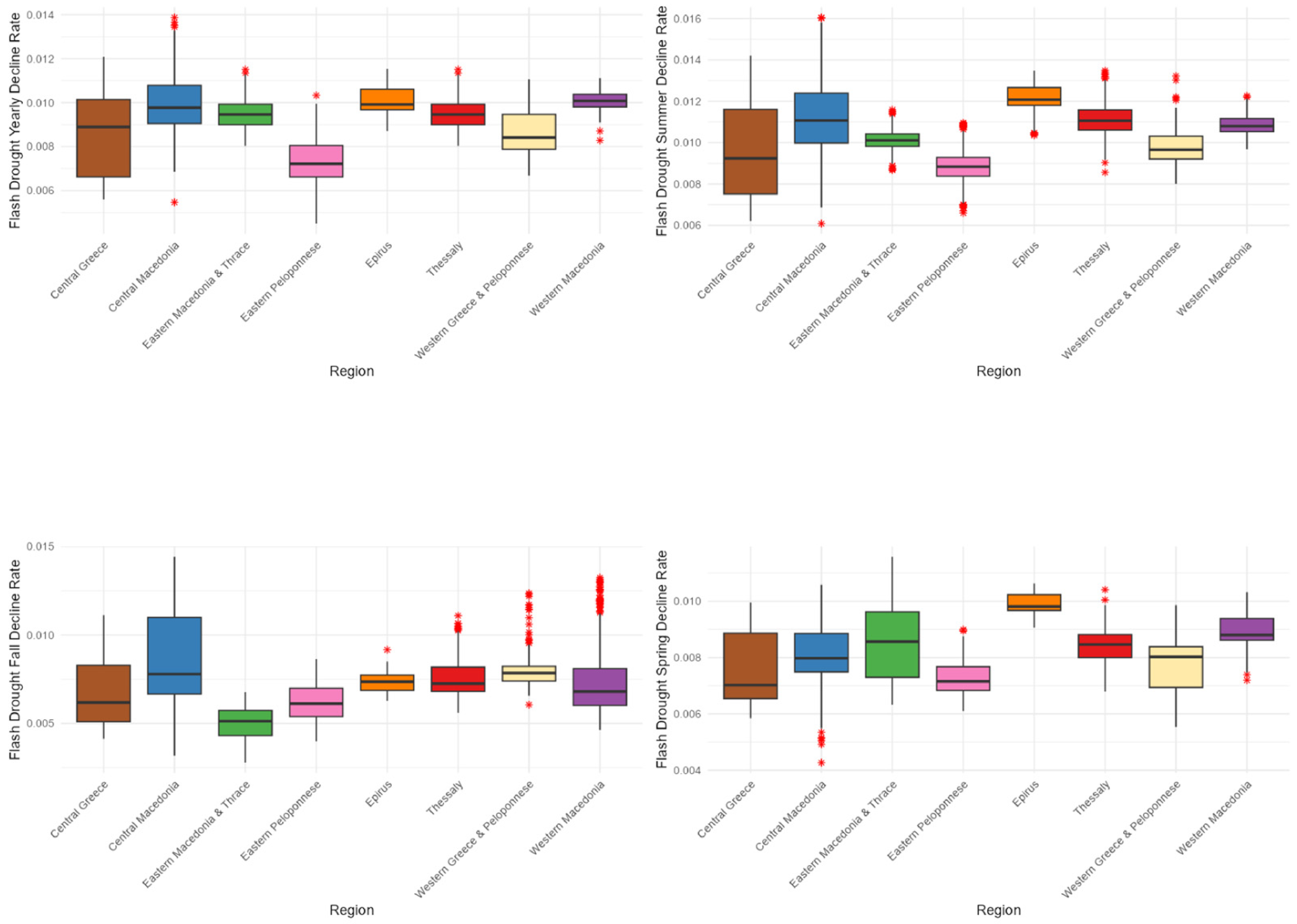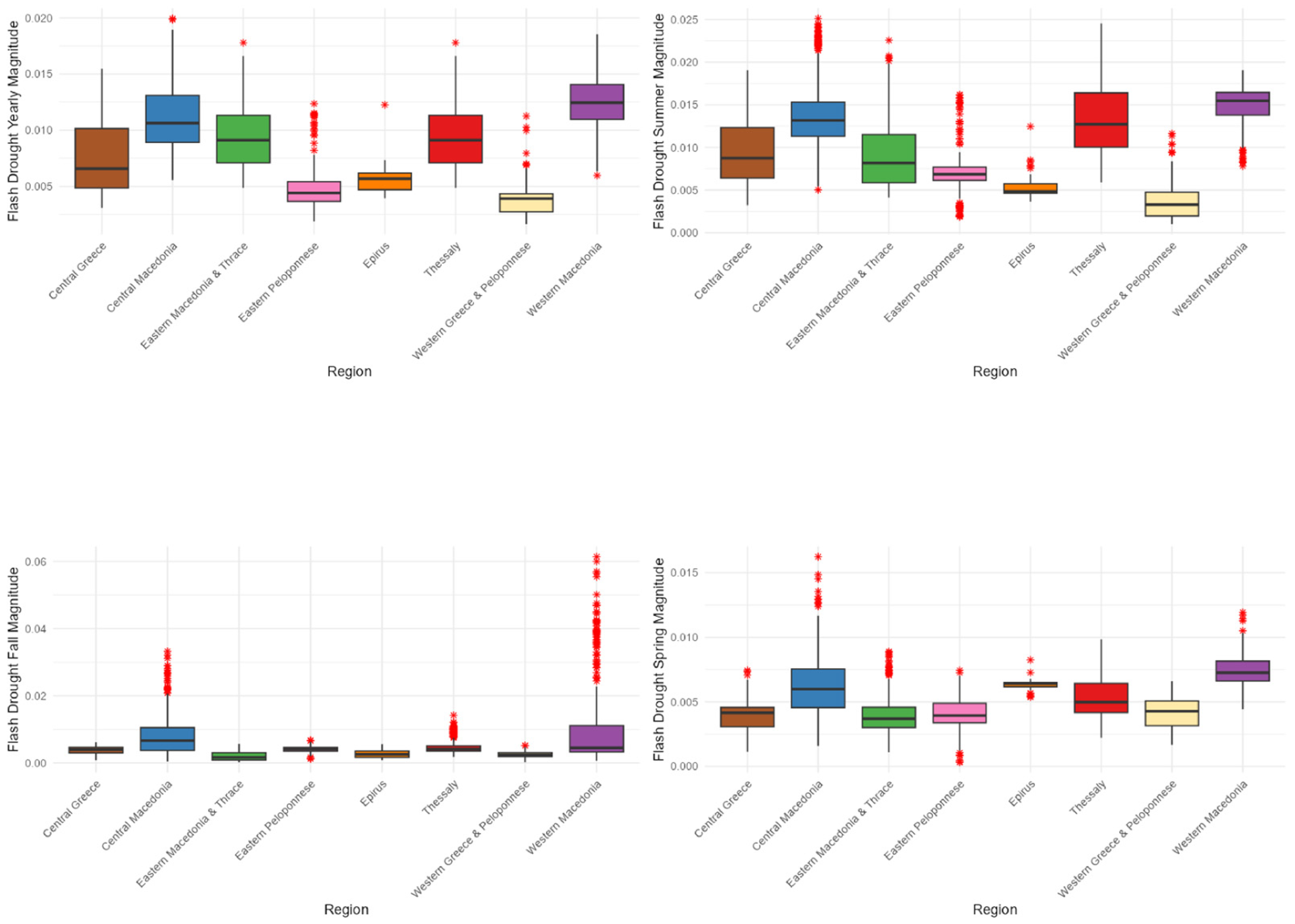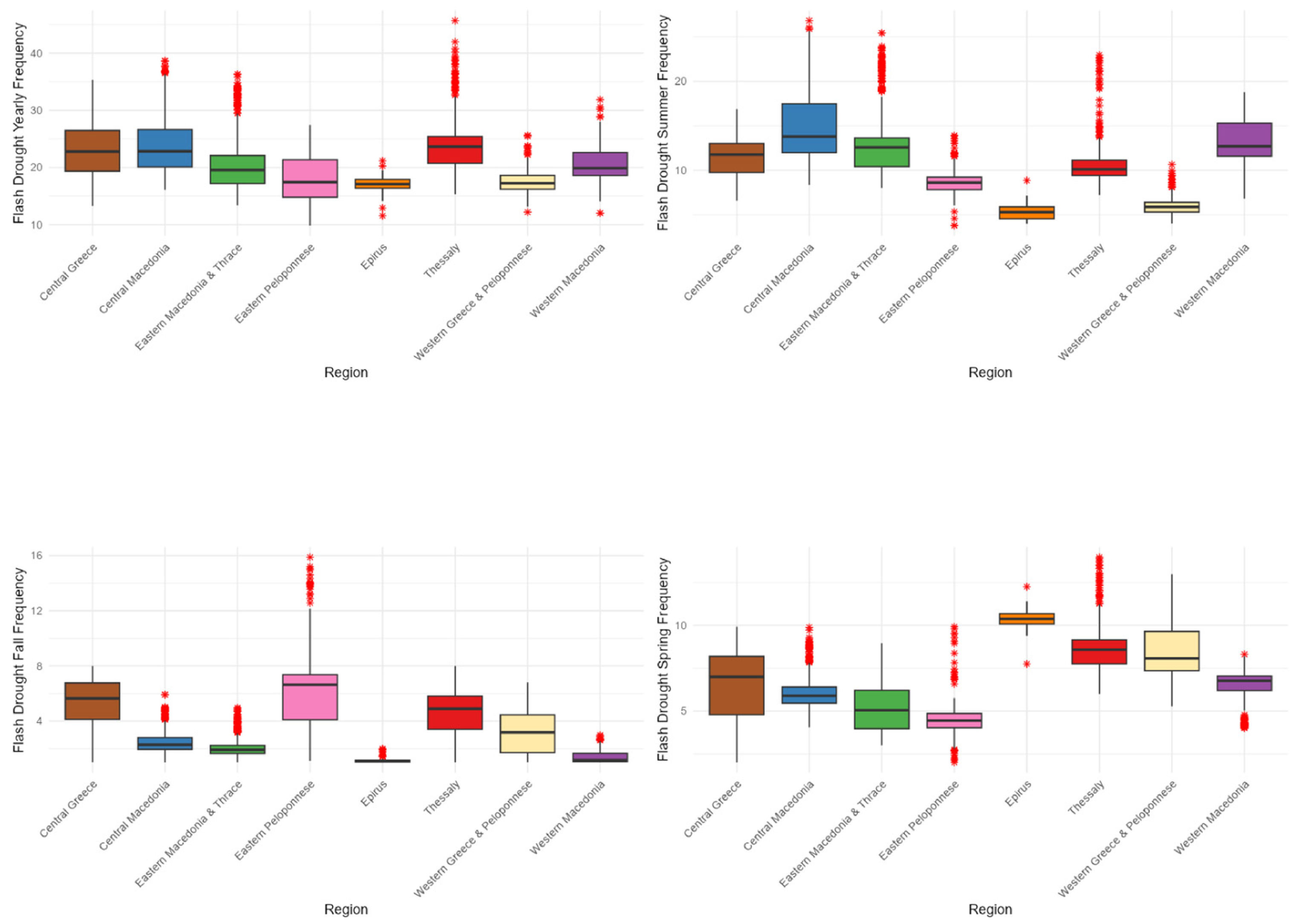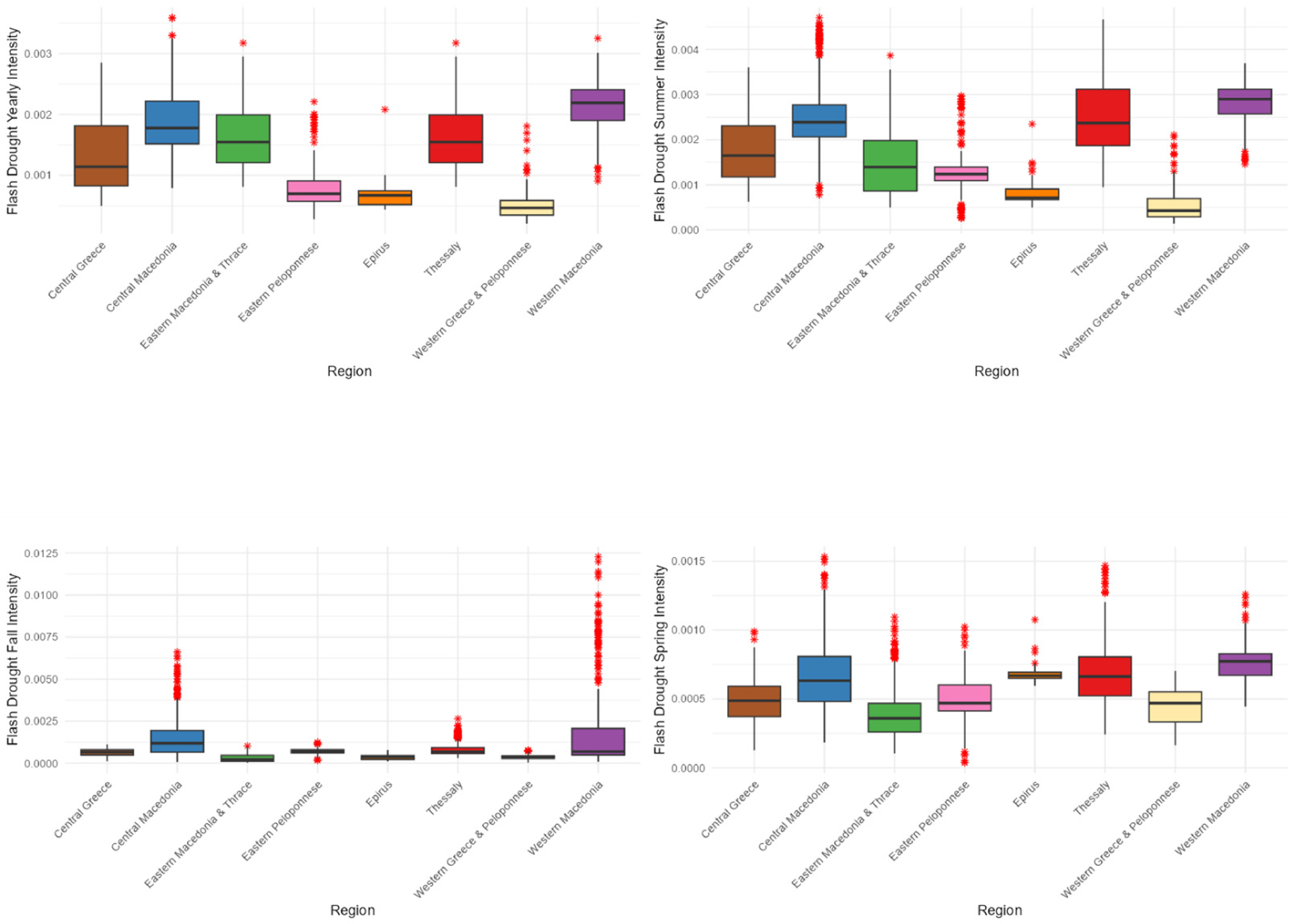 - Leivadiotis, E.; Psilovikos, A. The characteristics of flash droughts across Thessaly, Central Greece, from 1990 to 2024. In Proceedings of the 13th World Congress on Water Resources and Environment (EWRA 2025): New Challenges in Understanding and Managing Water-Related Risks in a Changing Environment, Palermo, Italy, 24–28 June 2025. [Google Scholar]