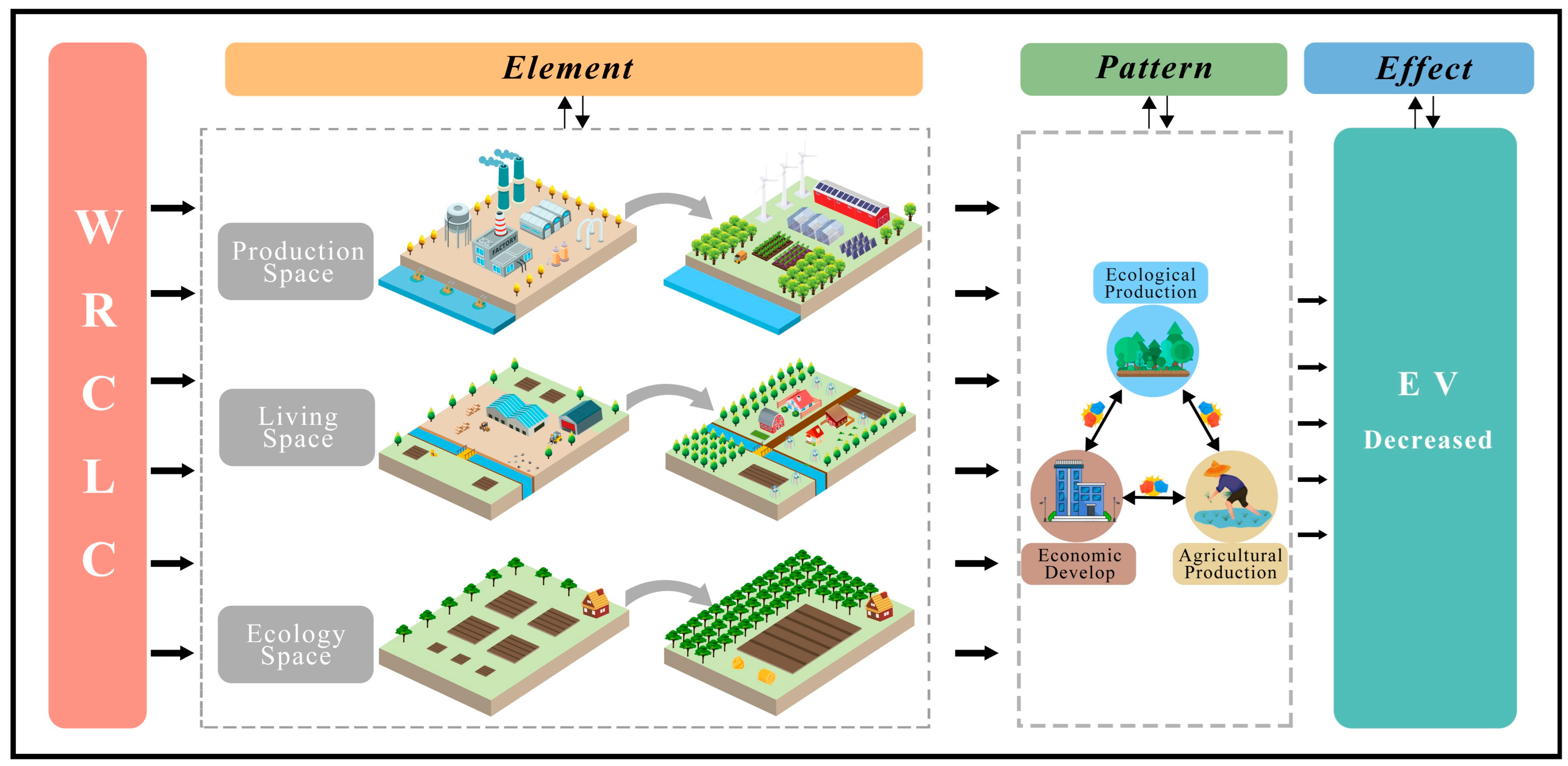 - The importance of “process management” and “chain optimization” during land consolidation must be emphasized to ensure that every phase—from planning and implementation to management—is dedicated to maintaining and constructing a functional, complementary, and structurally balanced land use spatial pattern. The underlying rationale for how WRCLC balances land use lies in its shift from “reactive remediation” of potential LUC to “proactive prevention and real-time regulation,” thereby averting irreversible damage to ecosystems caused by high-intensity conflicts. Consequently, local governments must adopt a holistic perspective throughout the consolidation process, ensuring that newly added and restored ecological spaces are effectively integrated into the original ecological network. This enhances the integrity and connectivity of ecological land, generating a synergistic “1 + 1>2” effect that amplifies overall ecological benefits.