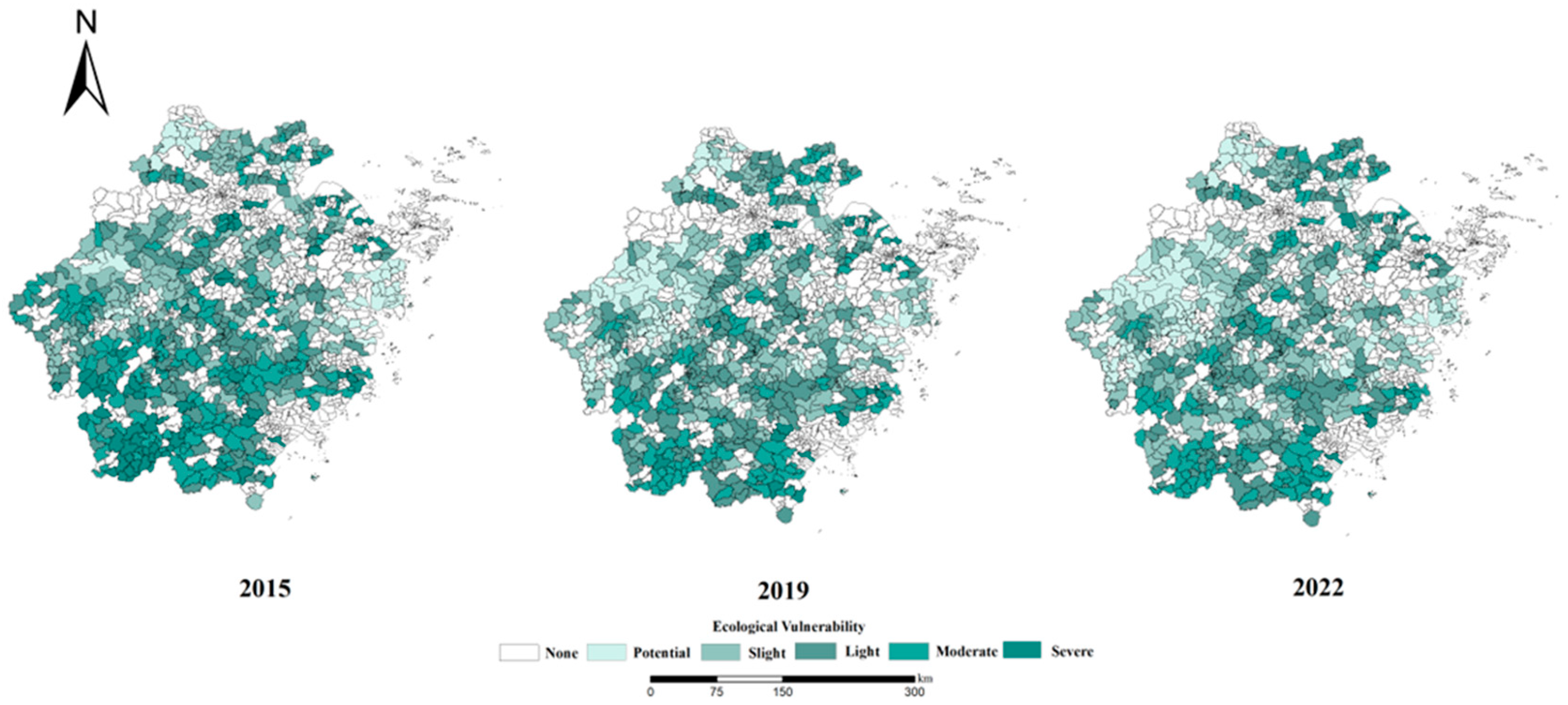 - Cao, J.; Yang, Y.; Deng, Z.; Hu, Y. Spatial and temporal evolution of ecological vulnerability based on vulnerability scoring diagram model in Shennongjia, China. Sci. Rep. 2022, 12, 5168. [Google Scholar] [CrossRef] [PubMed]