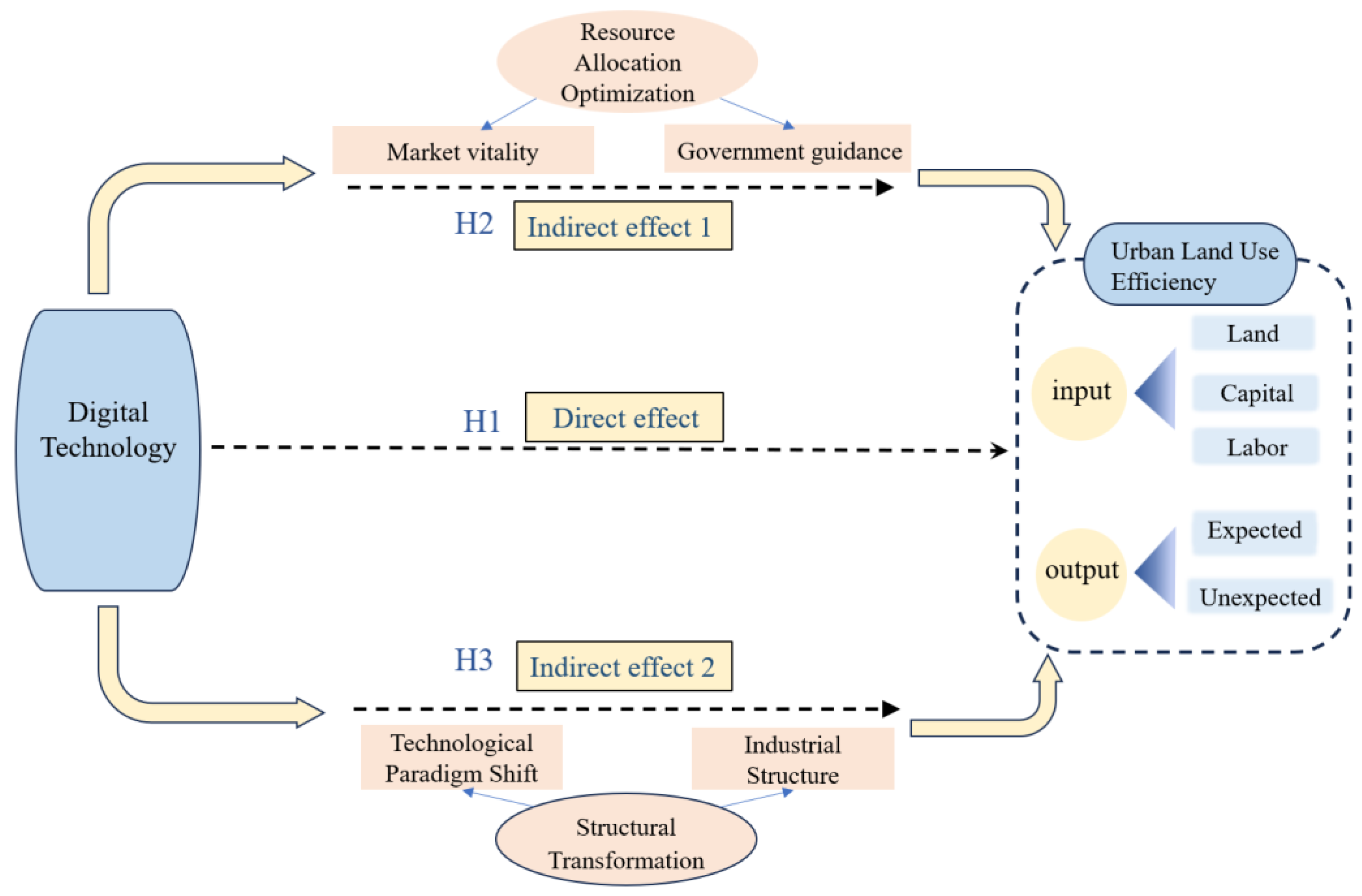 In the context of the current global resource and environmental constraints and the accelerated transformation of urban high-quality development, improving land use efficiency has become an important goal of urban governance. Traditionally, the allocation of land resources has been largely limited by problems such as information asymmetry, fac-tor mismatch, and policy response lag, resulting in extensive land use and low efficiency [49]. With the development of the digital age, digital technologies (including big data, artificial intelligence, the Internet of Things, and blockchain) have become an important force in promoting urban economic development [41,50]. Digital technologies are profoundly transforming the methods and efficiency of urban land use by enhancing information transmission efficiency, optimizing resource allocation, and fostering innovation. In terms of digital infrastructure, its development has optimized the city’s information transmission network, effectively reducing the costs of information acquisition and flow. This enables more efficient utilization of land resources, fostering intensive land use. The application of digital technologies, along with the widespread use of big data and artificial intelligence, has enhanced the precision of government decision-making in urban planning, land approval, and land use control. This has made land allocation more scientific and rational, reducing inefficient land utilization. In terms of digital platforms, their development accelerates the digital industrialization process and fosters new business models, playing a pivotal role in enhancing land output efficiency. Concurrently, digital technologies enable real-time monitoring of land use and facilitate dynamic adjustments to land allocation. Based on the above analysis, this paper proposes the following research hypotheses:
